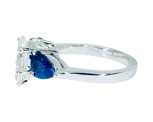 14K White Gold 1.69 Carats Pear Natural Diamond and Blue Sapphire Ring