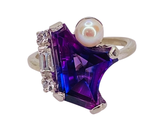 Estate Jewelry 10K White Gold Amethyst & Pearl Ring