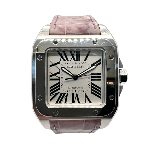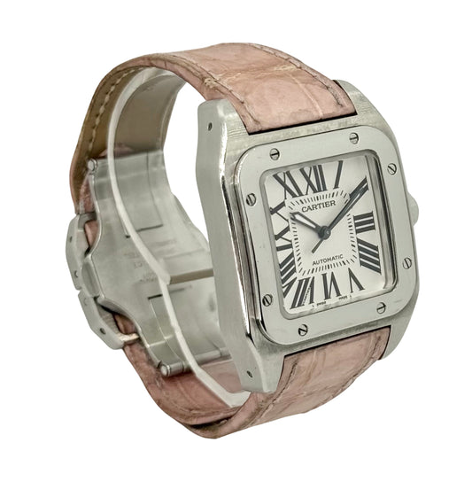 Cartier Santos 100 Automatic Silver Dial Pink Crocodile Strap 2878/ W20126X8