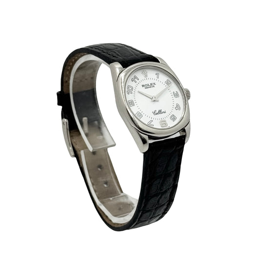 Rolex Cellini Danaos 18K White Gold White Dial Black Leather Strap 6229/9