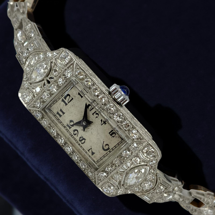 Vintage Ladies 18K/Platinum Art Deco Diamonds and Sapphire Manual Wind Watch