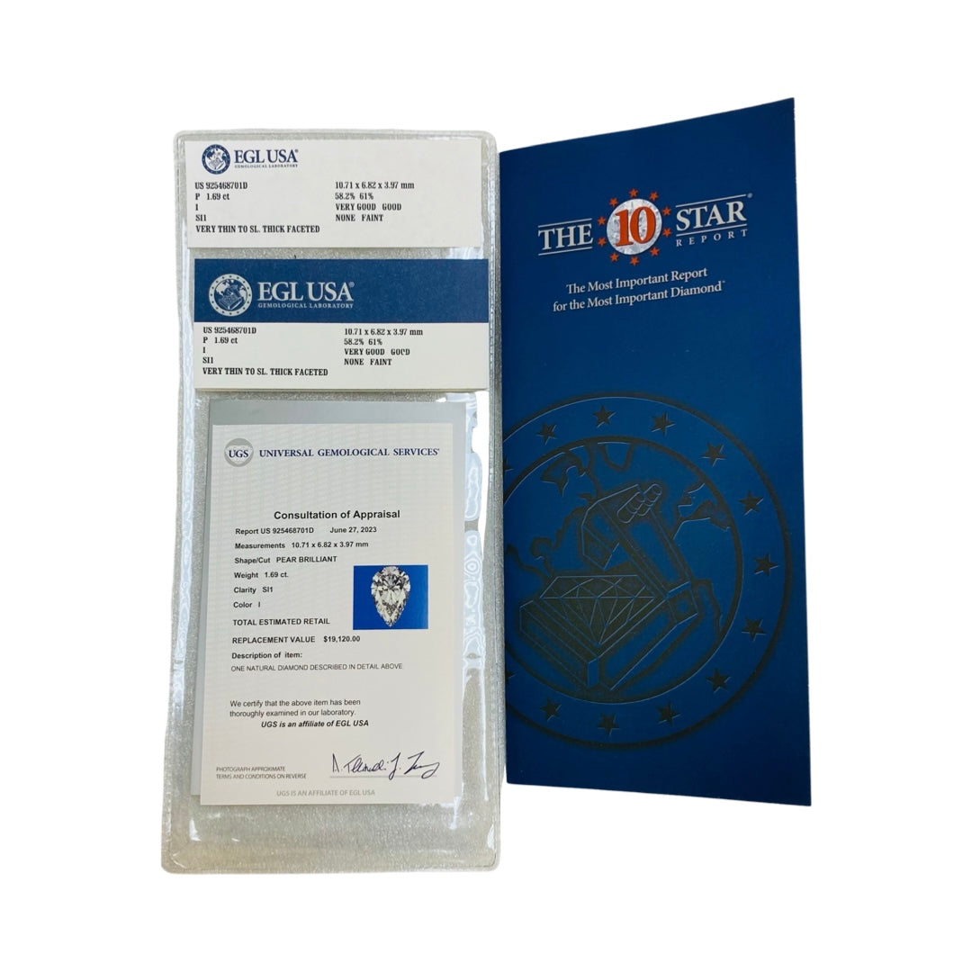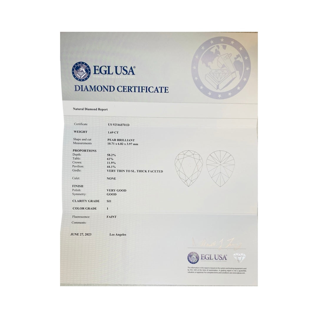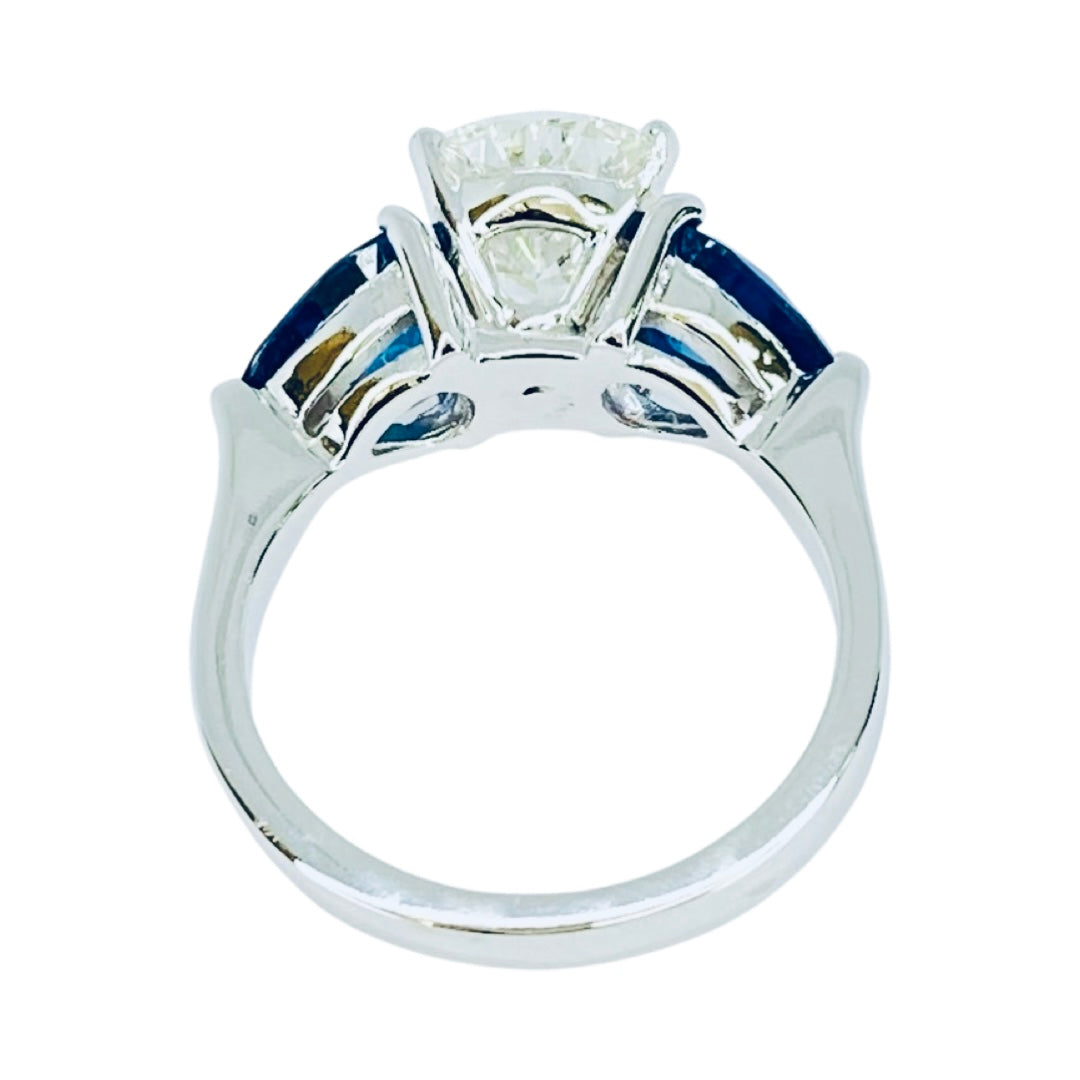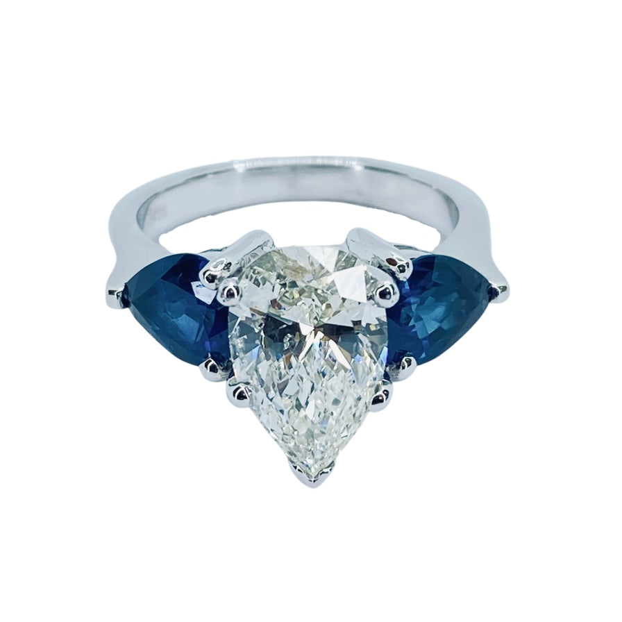 14K White Gold 1.69 Carats Pear Natural Diamond and Blue Sapphire Ring