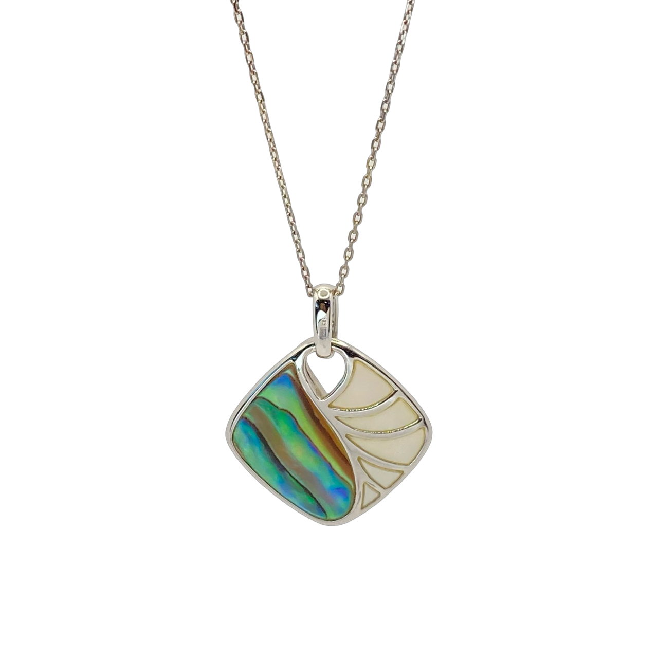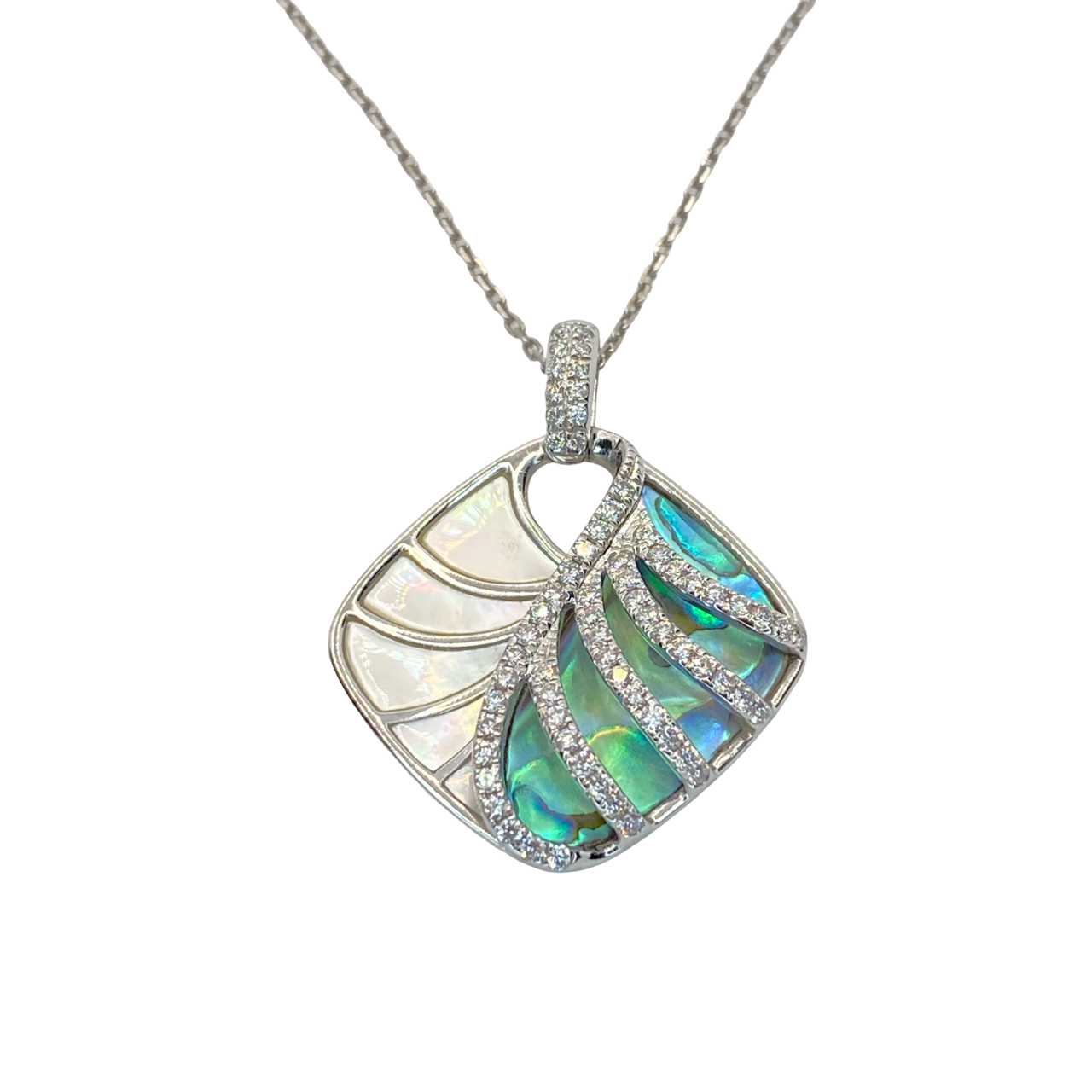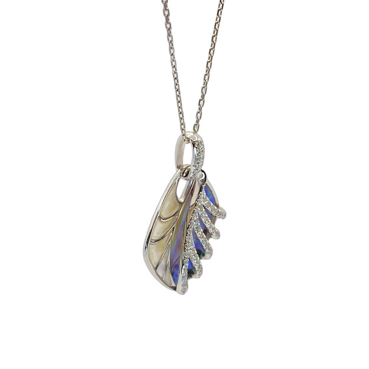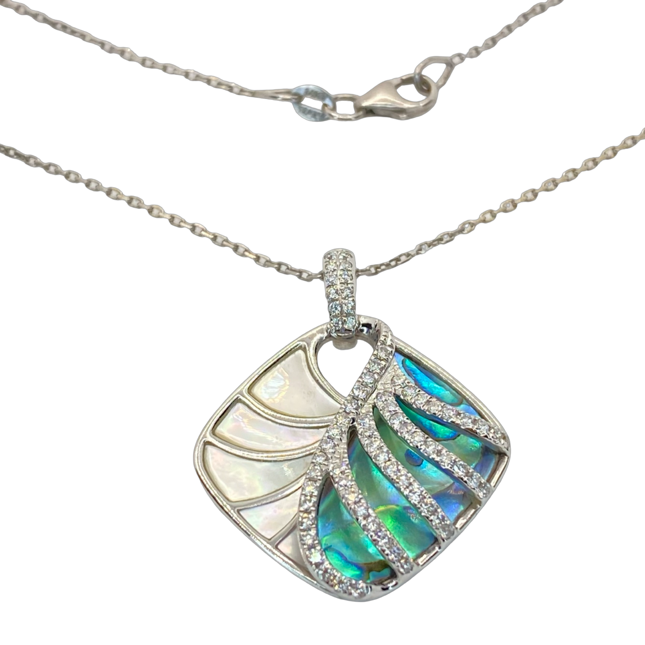 67 Round Brilliant Cut Diamonds weighing .41cttw cradle the artistic Abalone nestled adjacent White Mother of Pearl. Set in 14k White Gold this pendant also has a Diamond jeweled bail.