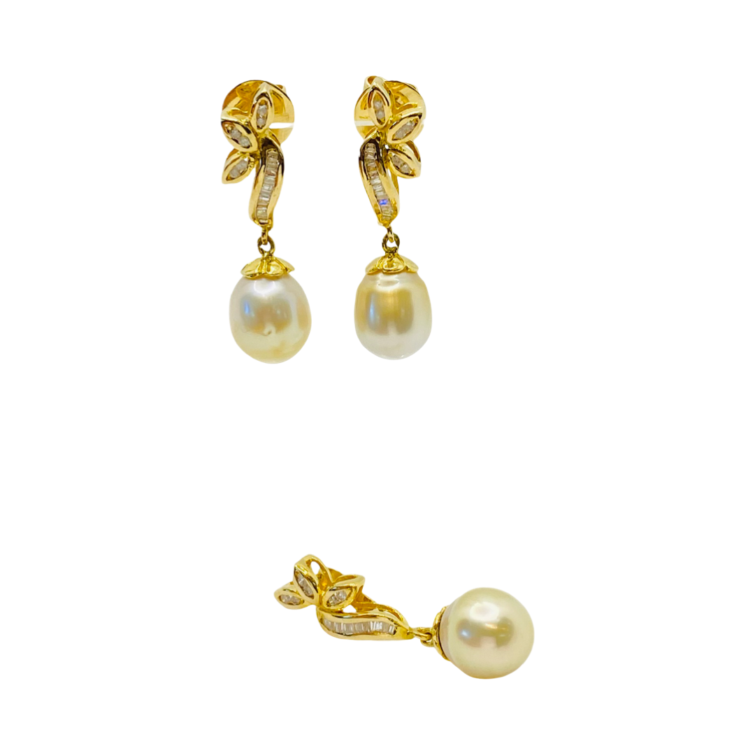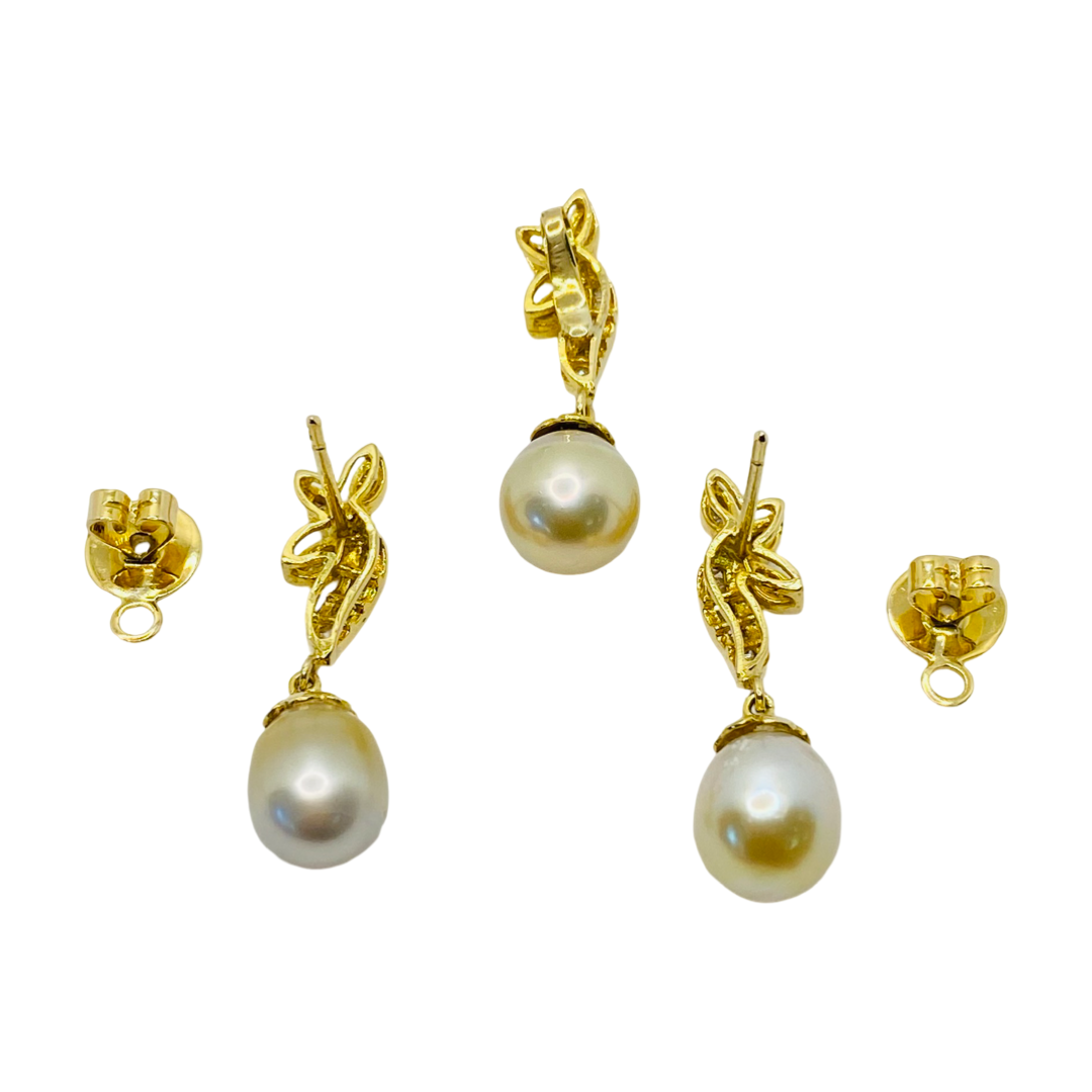 14K Yellow Gold Pearl Earrings and Pendant Set with Diamonds