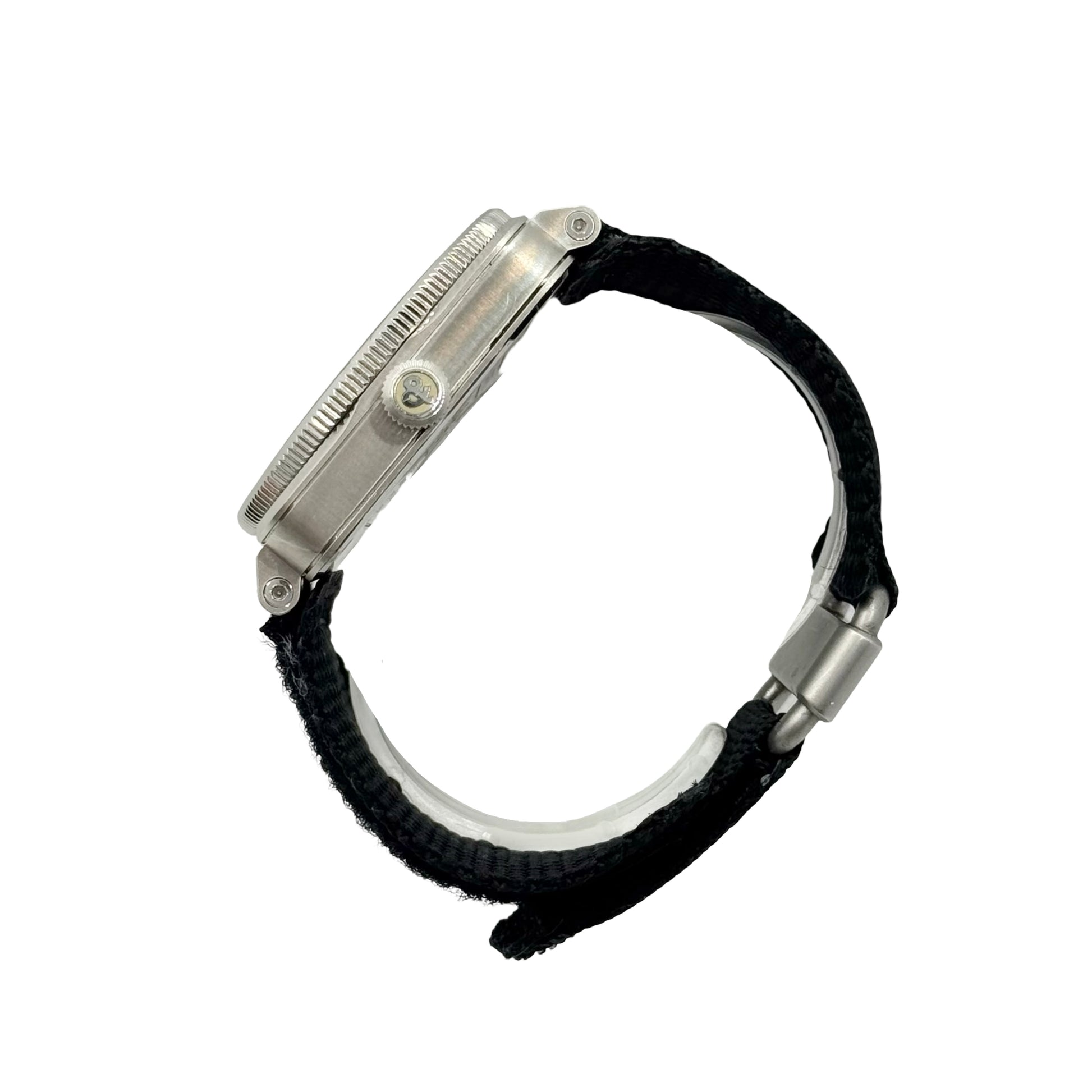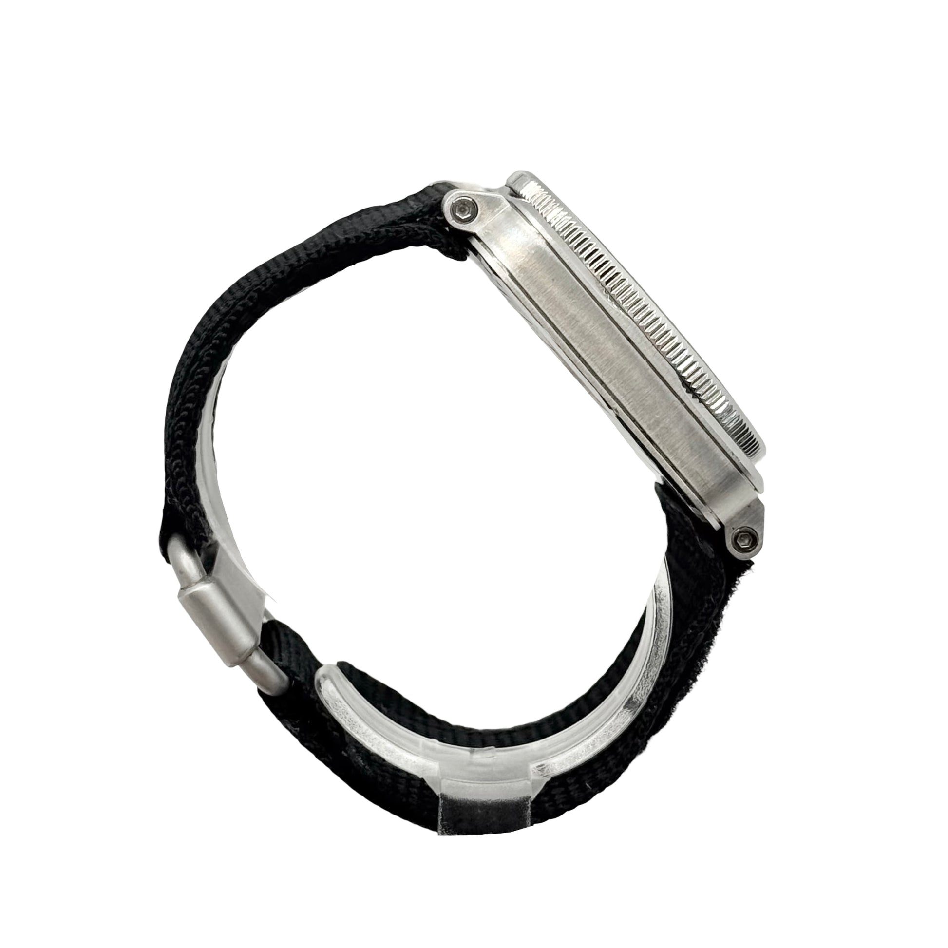 Bracelet material: Black coloured calfskin leather and ultra-resilient black synthetic fabric.