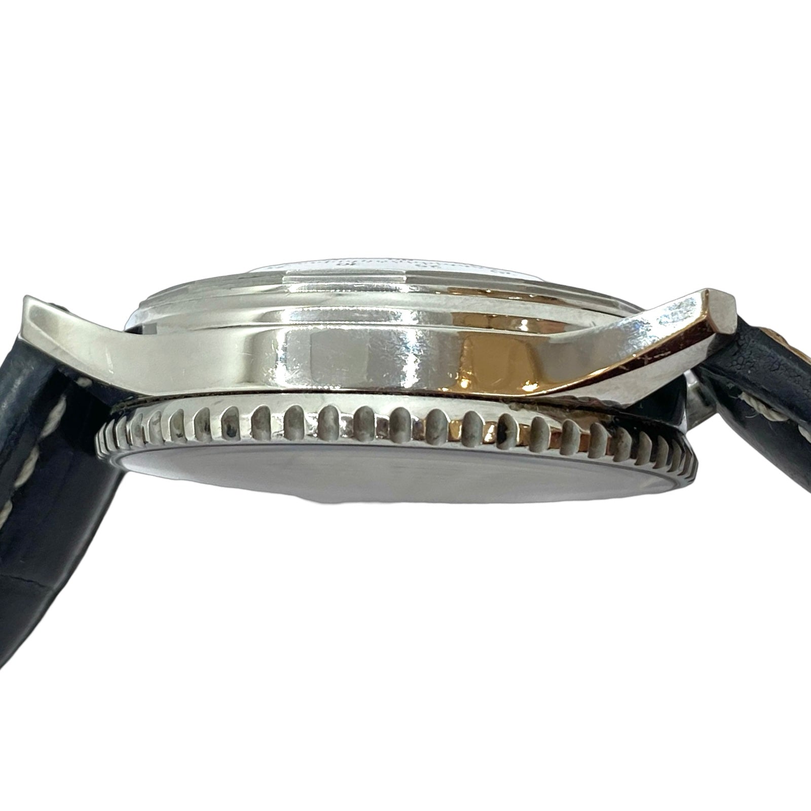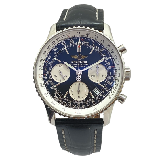 Navitimer Chronometre comes in various dial colors and also has dial variations where lumed arabics replace the redesigned applied baton hour indexes. All have red accents on both dial and the "sloped" slide rule; logo is "Breitling Wings & Anchor."