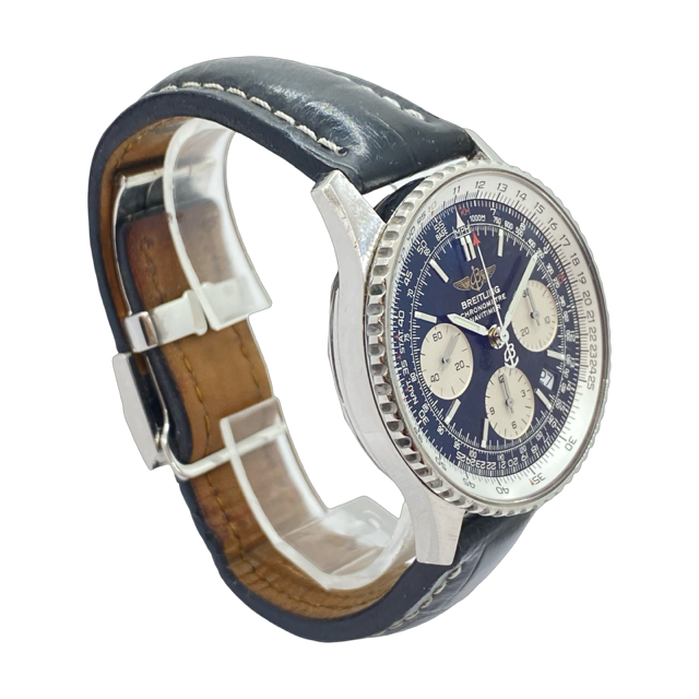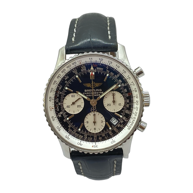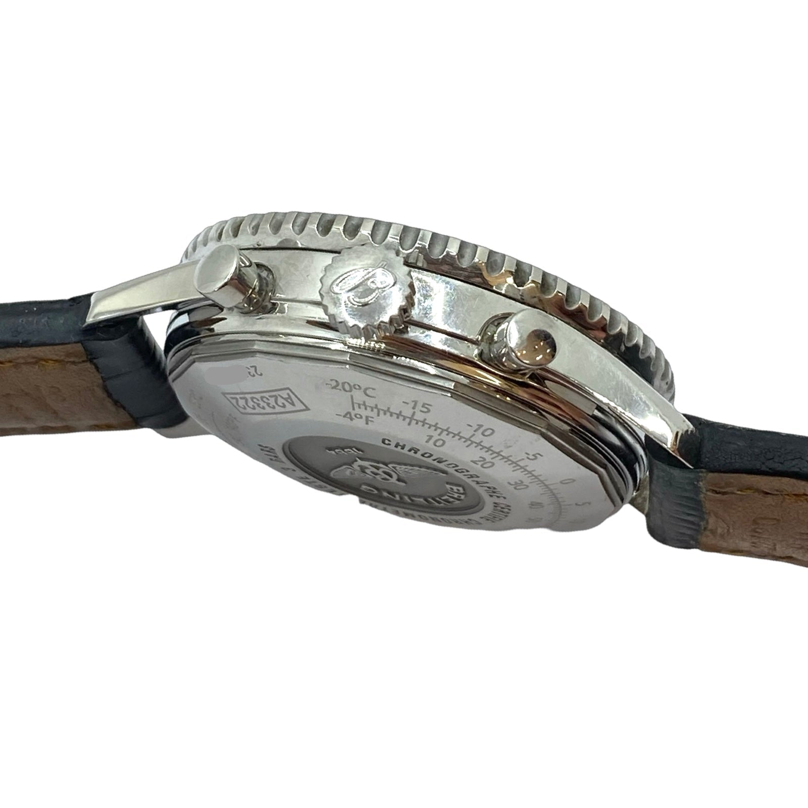 The Navitimer Chronometre has hour and minute counters and "running seconds" in the traditional 3/6/9 layout with a date display at 4:30. The chrono sweep hand has a red arrow tip and a "script B" counterweight.
