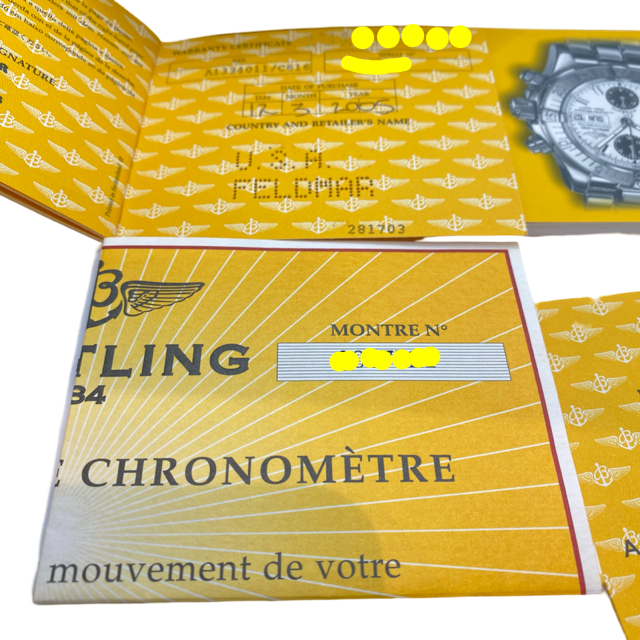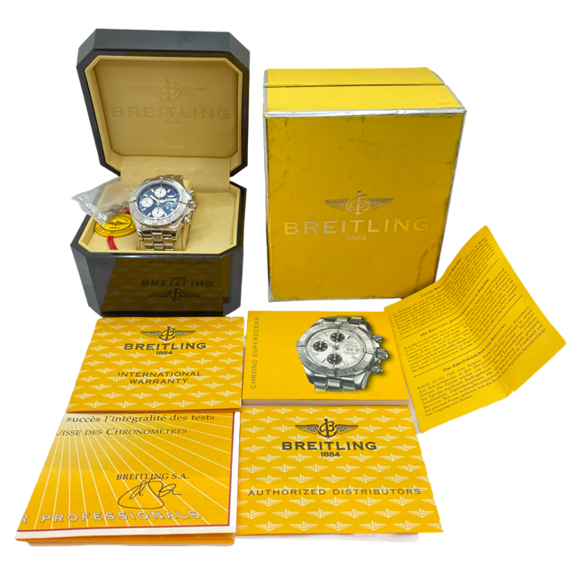 Accessories: Comes complete with Breitling yellow outer box, bakelite inner box, Chronometer tag, International Warranty, Chronometer Certificate, manual and extra links