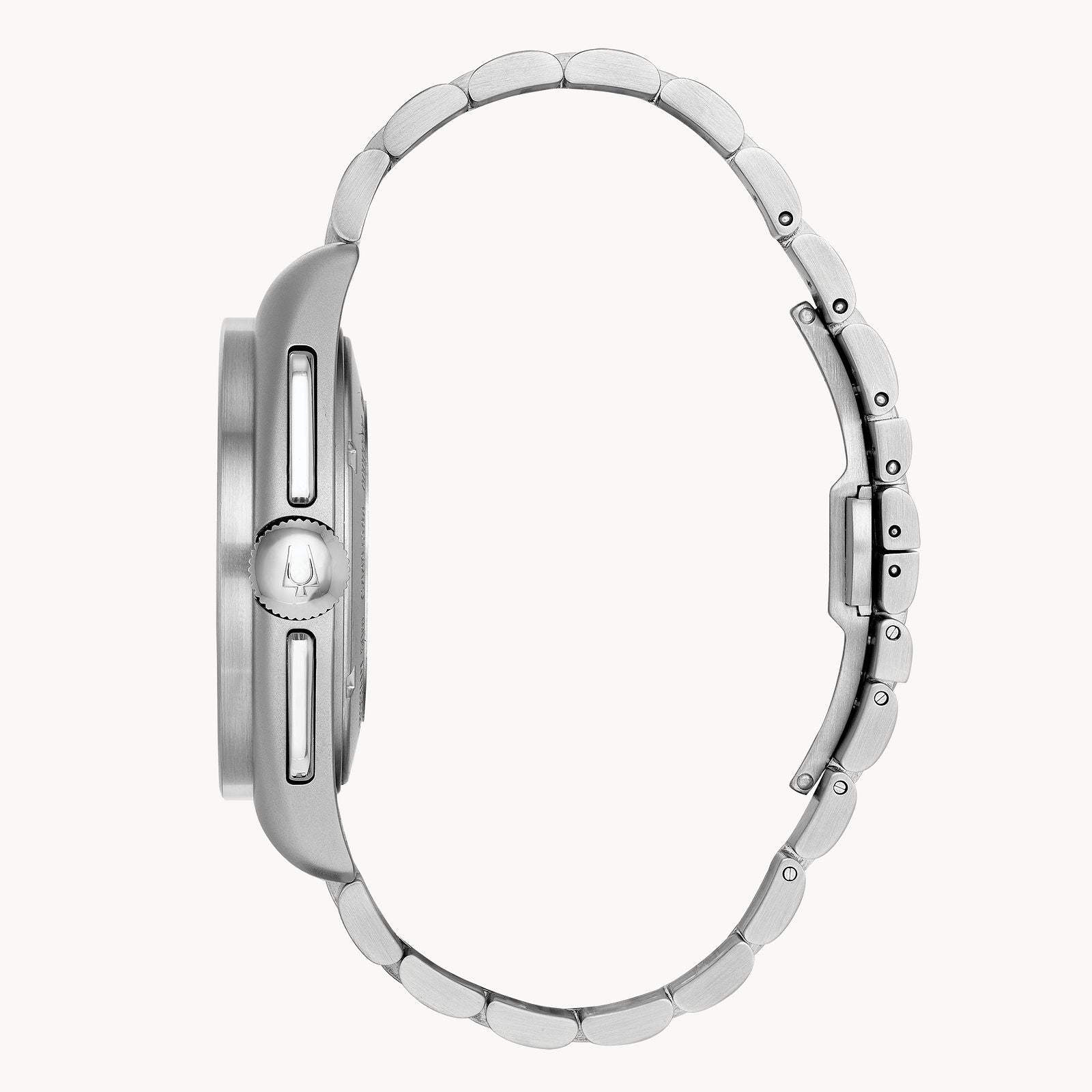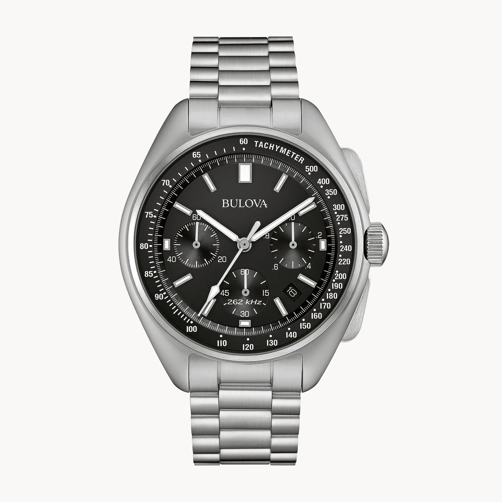 Bulova made space history on August 2, 1971--during the Apollo 15 mission, a moon pilot chronograph, customized for lunar conditions by Bulova engineers, was worn on the moon. Now Bulova makes history again with the special edition Lunar Pilot Chronograph, updated with our exclusive high performance quartz movement with a frequency of 262 kHz for unparalleled accuracy, continuing a history of precision timing. In stainless steel screw-back case in silver-tone finish and black dial and sapphire glass.