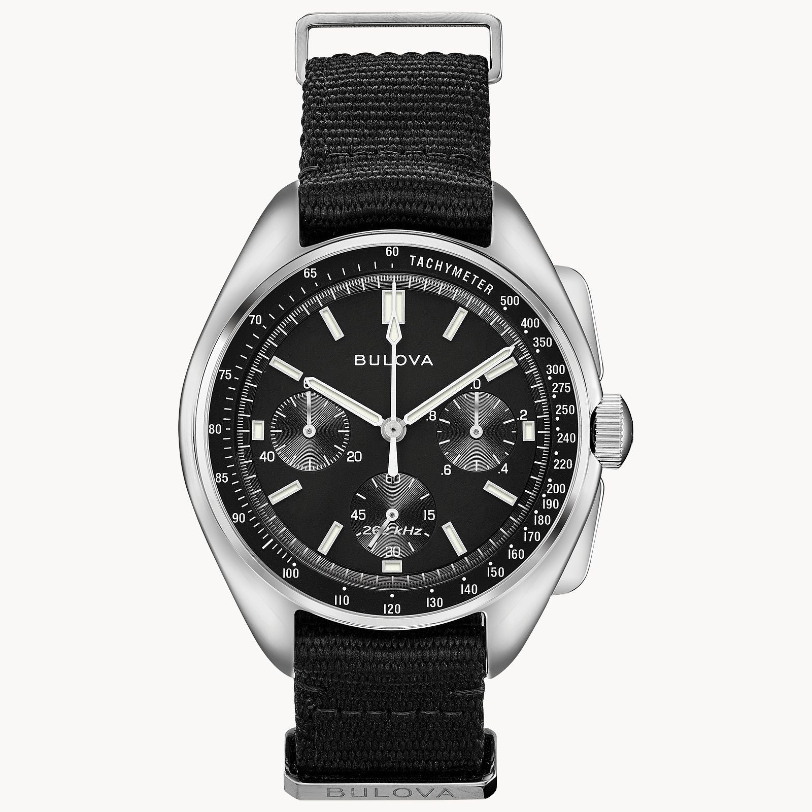 Special Edition Lunar Pilot Chronograph from the Archive Series. Six-hand chronograph movement features proprietary high-performance quartz technology with 262 kHz vibrational frequency for precise accuracy. This new edition is complete with polished 316L surgical-grade stainless steel case, black dial with white accents, anti-reflective sapphire crystal, black polyester NATO strap with three-piece buckle closure, and water resistance to 50 meters.