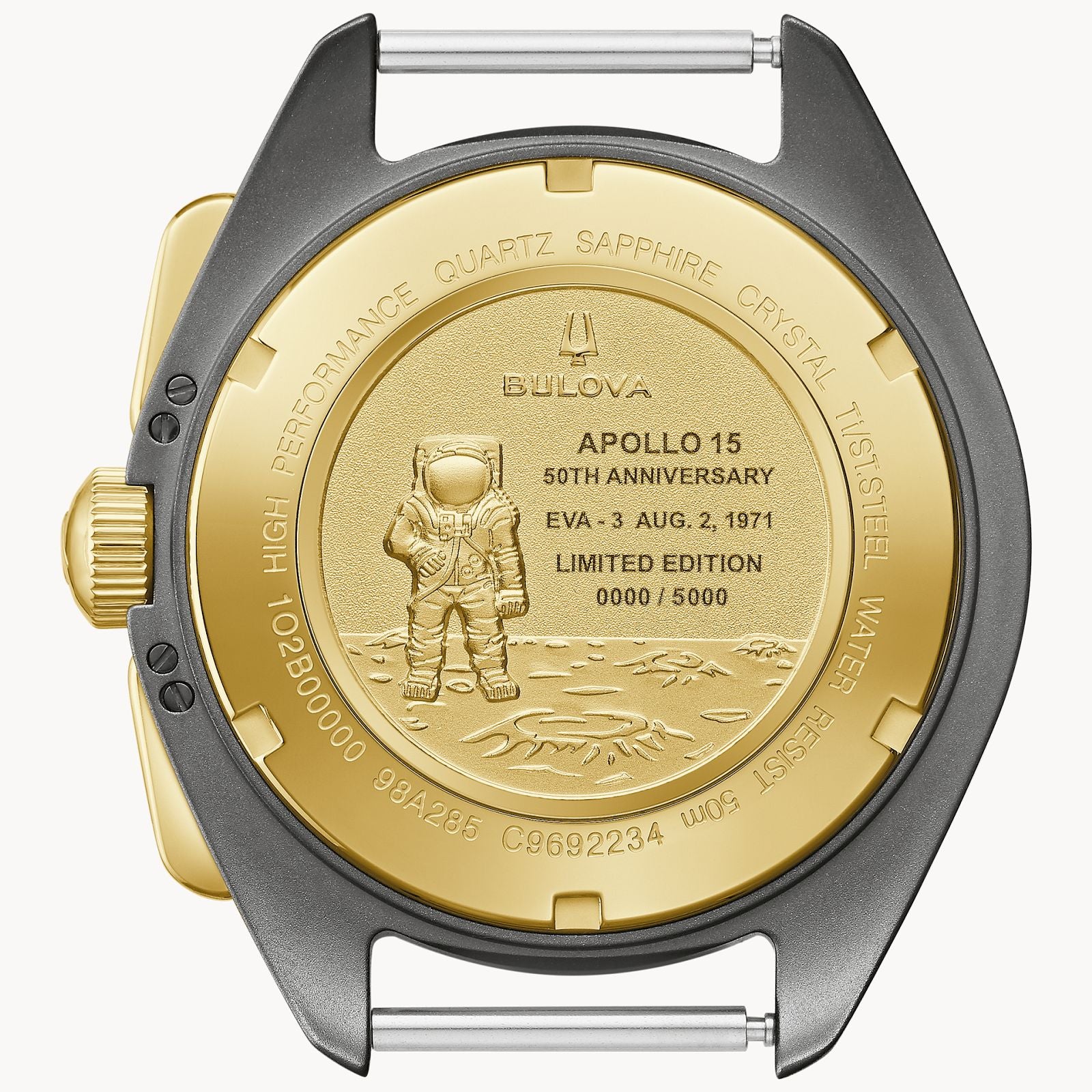 The Limited Edition Lunar Pilot Chronograph from the Archive Series celebrates the 50th anniversary of Apollo 15 and the lunar landing. Inspired by the original, this iconic timepiece features a highly durable Titanium Grade 5 case with gold-tone stainless steel details set against a rich gray dial, and a commemorative design relief on the case back highlighting the historic achievement. The six-hand chronograph movement features our proprietary high-performance quartz technology with 262 kHz vibrational frequency for precise accuracy. The luxury watch also comes in special packaging with a commemorative coin and booklet detailing the mission and its success. Limited to 5000 numbered pieces worldwide, it’s the perfect collector’s piece for watch and space enthusiasts alike.