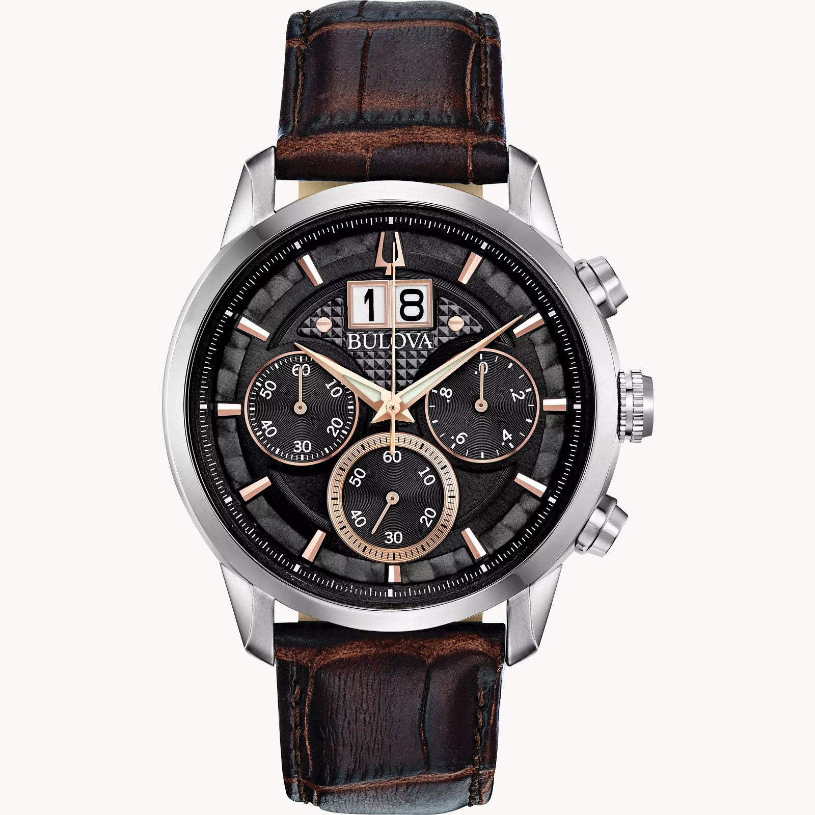 Six-hand chronograph with silver tone stainless steel case and brown leather strap. Black dial with rose gold tone accents, featuring an oversized date window at the 12 o'clock position. Watch features a domed mineral crystal, quartz movement, and water resistance to 30 meters.
