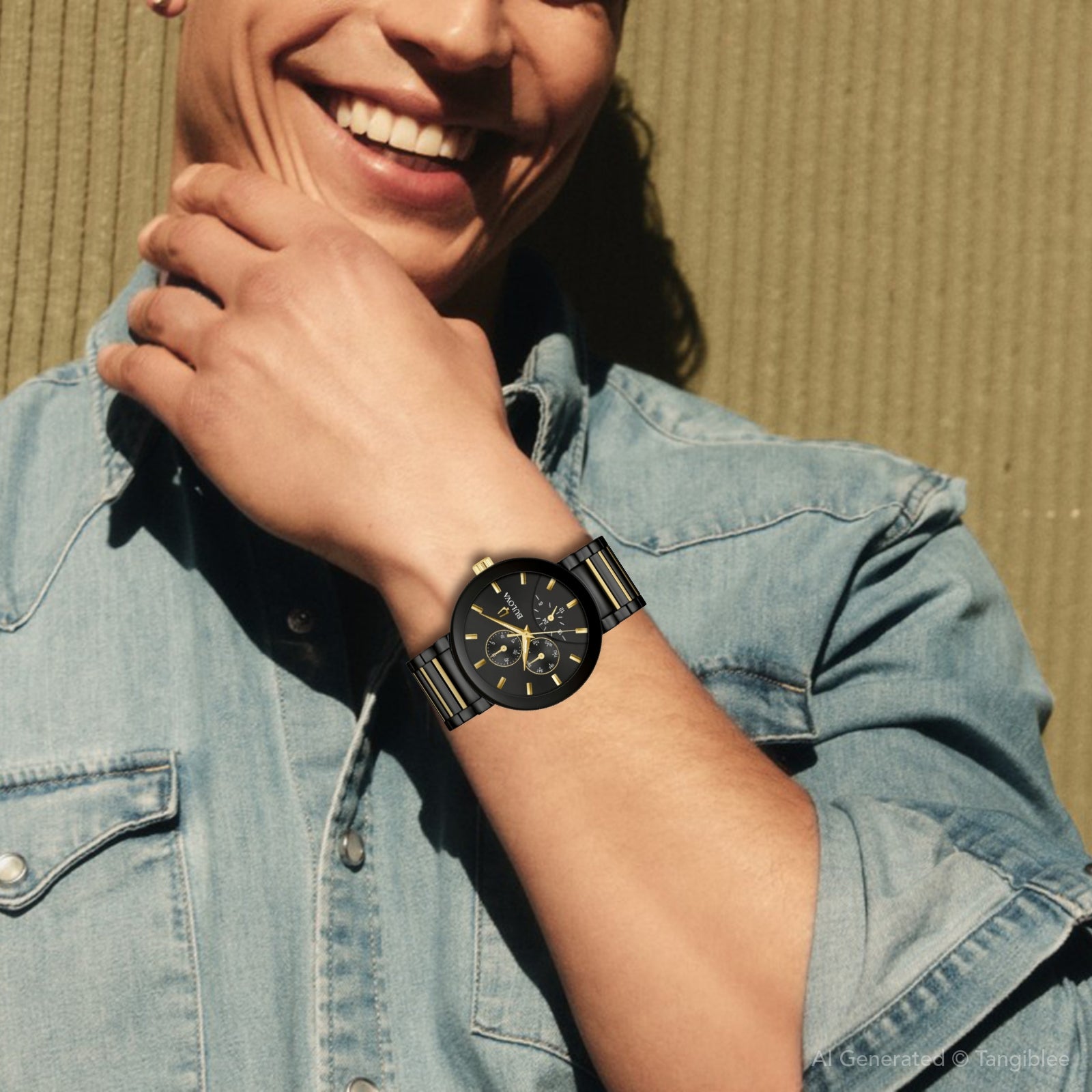 The Bulova men’s Modern collection breaks the mold by pushing the boundaries of modern watch design. The sleek silver- and gold-tone stainless steel case features an edge-to-edge domed mineral crystal with deep blue metallization for an exceptionally modern look. The captivating blue dial features a combination of gold-tone markers and hands with a 24-hour display and registers for the day and date. A multi-link silver- and gold-tone stainless steel bracelet creates a seamless silhouette and has a deployant closure. Unwavering in its modernity while offering uncompromising style, this Bulova men’s timepiece is an exquisite companion for any occasion.