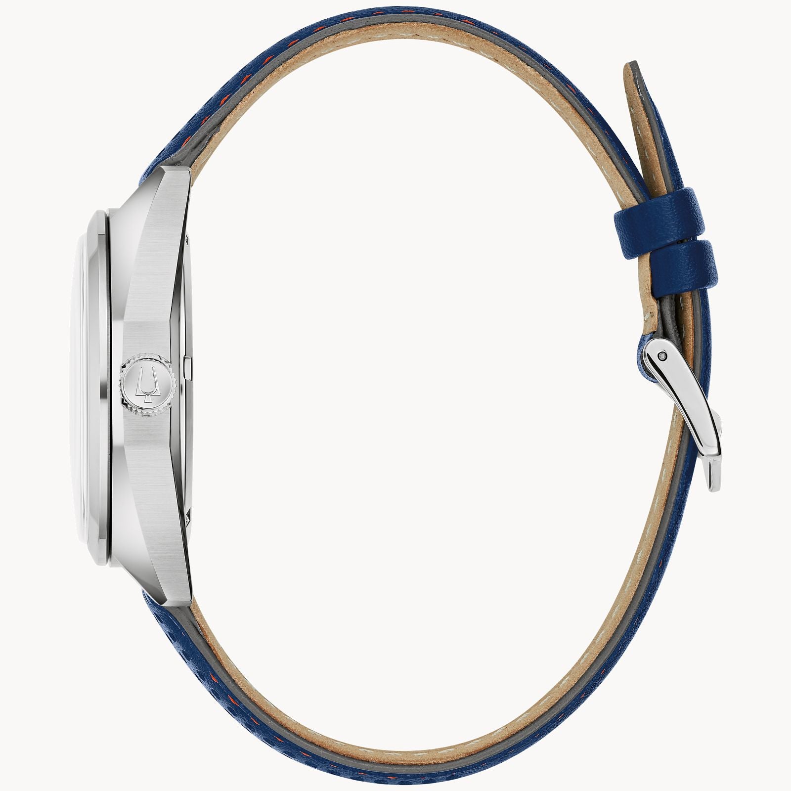 Straight from the 1970s comes this limited edition Bulova 1973 Jet Star, an iconic model from the brands impressive history, now equipped with an equally impressive movement. Borrowing from its historic forebear, the stainless steel case features a striking angular design with broad facets and a domed sapphire crystal. The vivid silver-tone sunburst dial is accented by a blue and red chapter ring, applied blue and red hour markers, and bold red hands. Luminescent plots at each hour and fill in the hands allow for exceptional legibility in every environment, while a date display sits perfectly at 3 o’clock. The new Jet Star is powered by Bulova’s Precisionist movement, a revolutionary 8-jewel quartz mechanism vibrating at a remarkable 262kHz, accurate to 5 seconds per month with increased resistance to temperature changes, and with a sweeping seconds hand. Complementing the stainless steel case is a matching bracelet with a deployant clasp closure and latched spring bars for easy release. This limited edition model also includes a richly colored blue leather strap and is presented in special packaging with a numbered limited edition card. Strut your stuff in legendary style with the high-flying limited edition Bulova 1973 Jet Star, a legendary design recreated for the modern connoisseur.