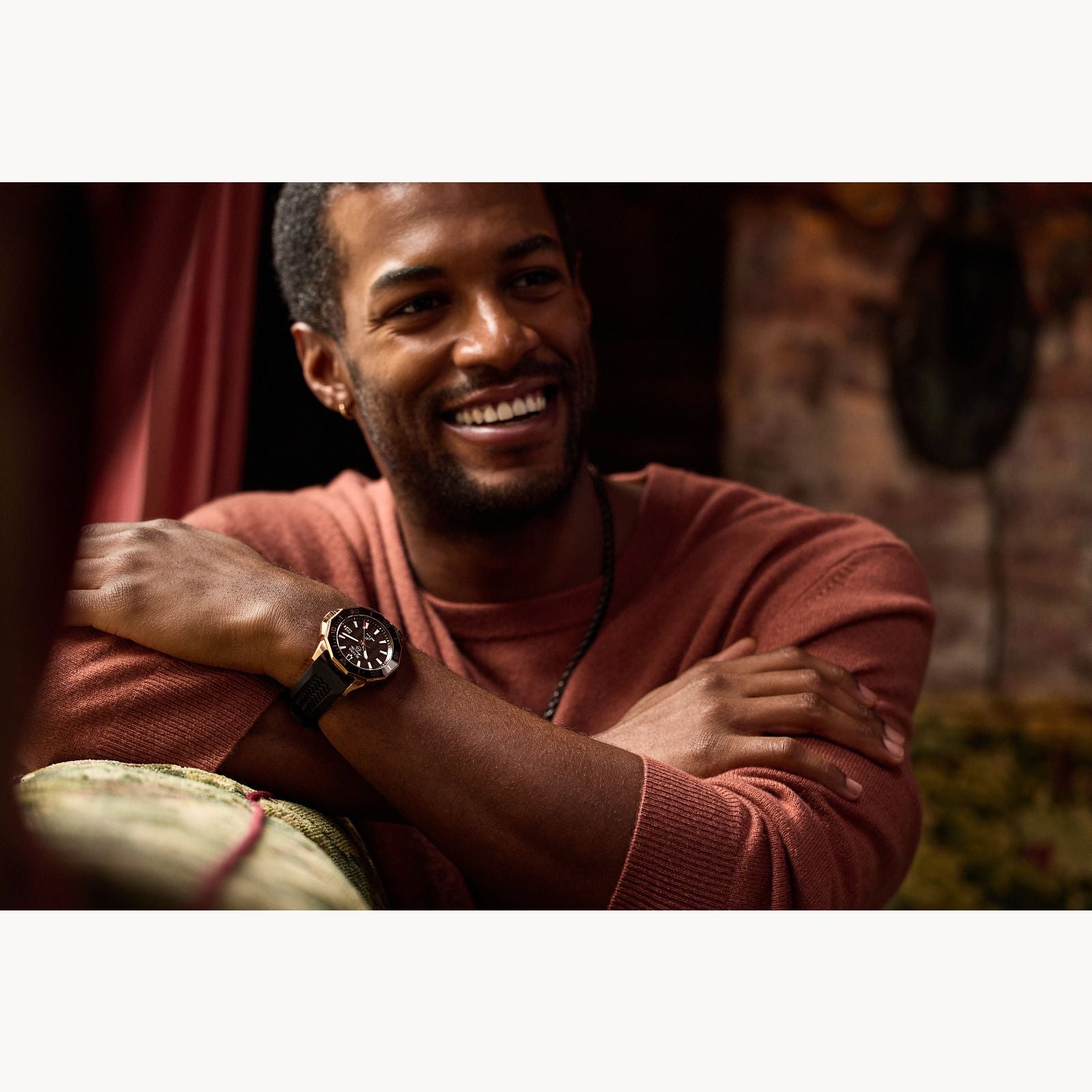 An incredibly bold design, this men’s Bulova Marine Star Precisionist sport watch pushes the limits with Bulova’s cutting edge technology and a strikingly modern case. Defined by a rugged, angular profile, the 43mm rose gold-tone stainless steel case features brushed facets and polished accents, with a unidirectional timing bezel with a ceramic insert, a sapphire crystal, and a screw-down crown ensuring 200m water resistance. The rich brown dial takes its inspiration from the undulating crests of the ocean, with a wave pattern accented by applied hour markers and a bold handset, all featuring luminescent material for unrivaled legibility in all conditions. A date window is position at 3 o’clock, while the red-tipped seconds hand brings a subtle pop of color and sweeps smoothly around the dial thanks to Bulova’s proprietary Precisionist movement, a revolutionary 8-jewel quartz mechanism vibrating at a remarkable 262kHz and accurate to seconds per year with increased resistance to temperature changes. Paired with a durable silicone strap with a pin buckle closure, this men’s Bulova timepiece is equipped to handle everything from the office to the ocean.