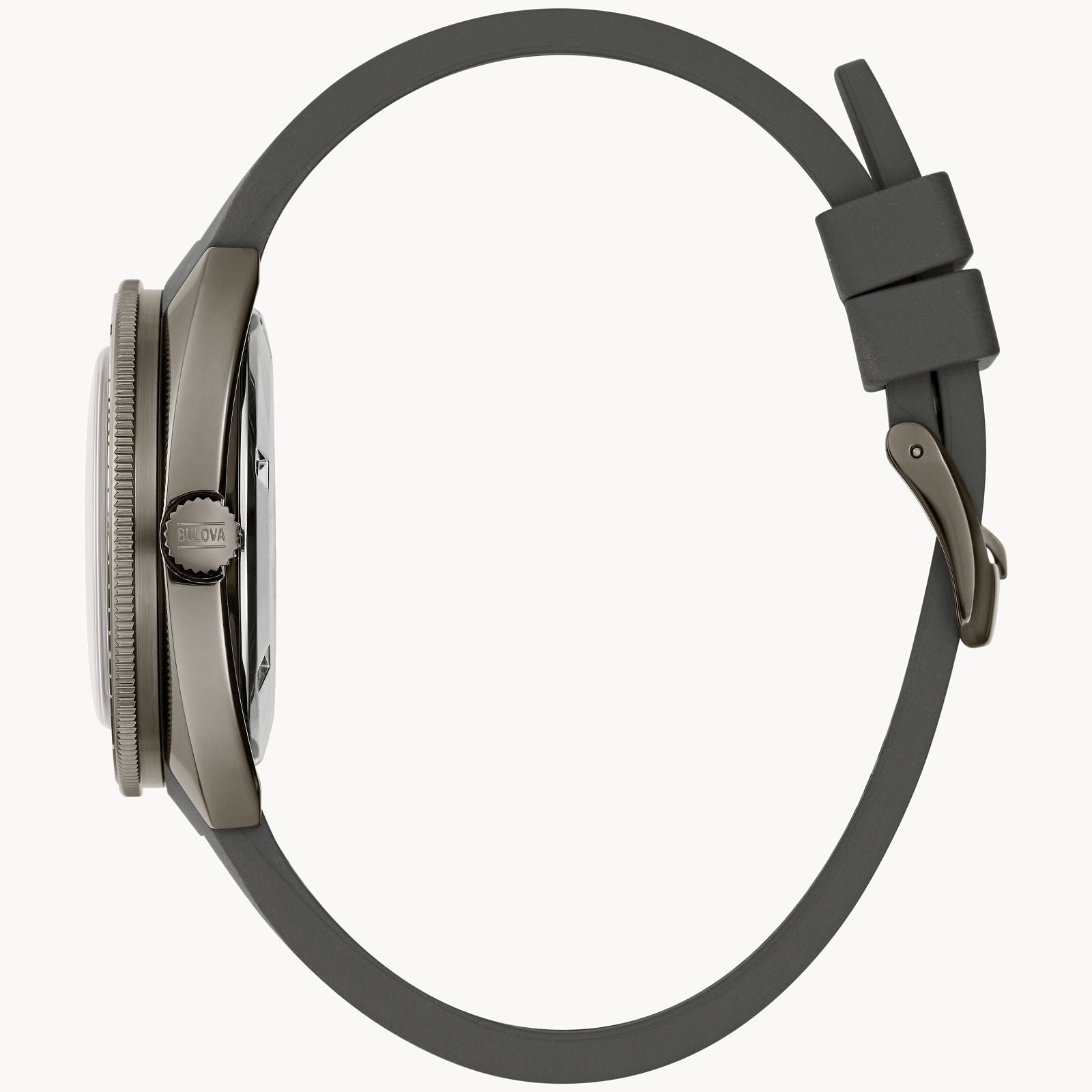 For the uncompromising thrill seeker, there is no alternative to this all-new Bulova men’s Oceanographer GMT. The perfectly sized 41mm stainless steel case features a grey IP coating, a screw-down crown that provides 200 meters of water resistance, and a unidirectional rotating black-and-white timing bezel. Under the box sapphire crystal, the fully luminescent white dial features a black 24-hours scale and minute markers, applied round luminescent hour markers, and a date display. The bold handset features luminescent fill for exceptional low-light legibility, and an independently adjusted hour hand that allows you to quickly set the local time. The Oceanographer GMT is powered by a self-winding GMT movement with 24-jewels and a power reserve of 42 hours, protected by a screw-down caseback. Paired perfectly with a fitted black silicone strap with a rugged three-piece buckle. When you need a timepiece that can go everywhere you want and never fall behind, the men’s Bulova Oceanographer GMT is the only option.