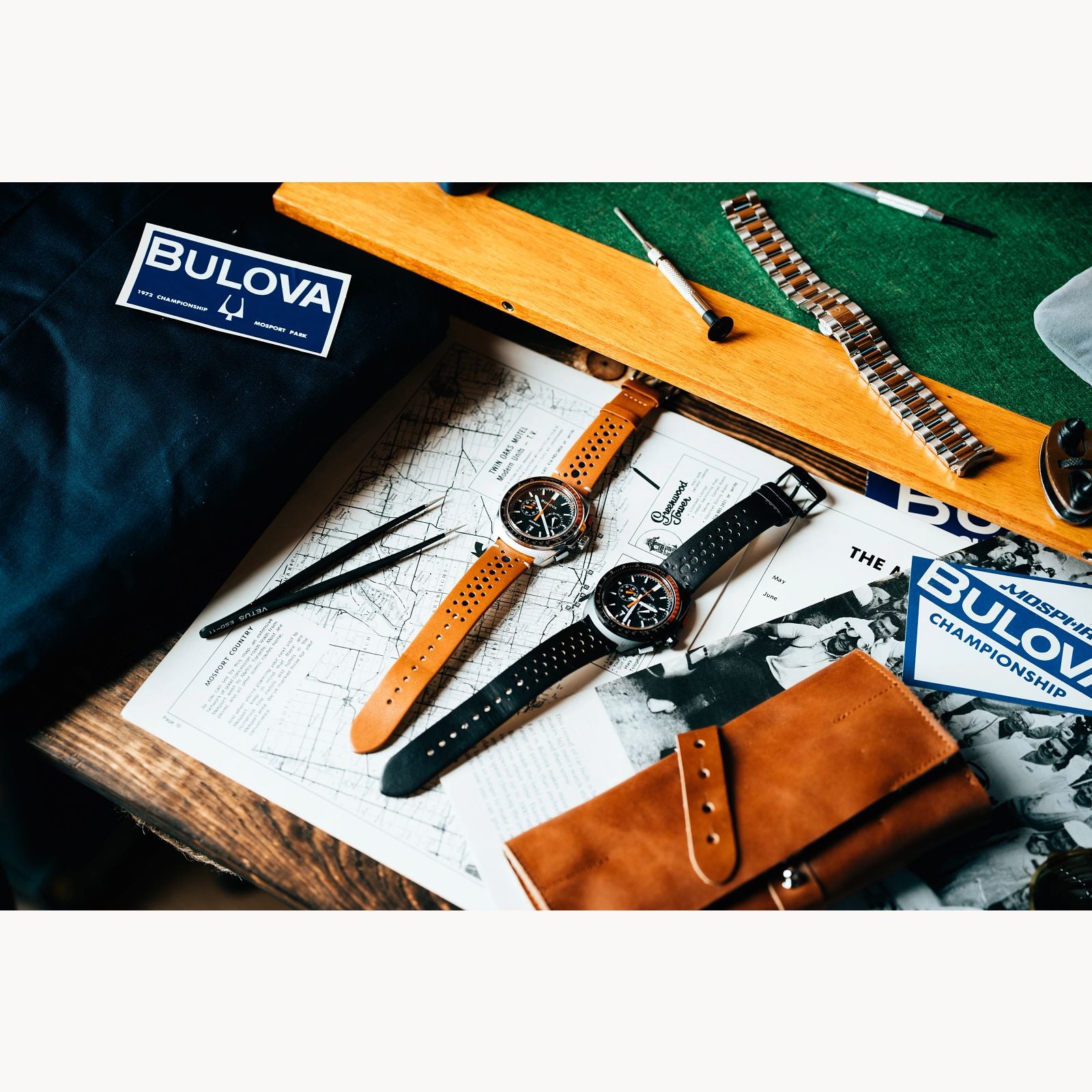 Built on Bulova’s vibrant history in motorsport – from soap box derbies to the upper echelons of auto racing – the new men’s Racer chronograph watch is fine-tuned and designed for performance. The contoured black IP stainless steel case features a unique design evoking the aerodynamic curves of the world’s fastest automobiles. A two-tone orange and black tachymeter ring offers further functionality, while pronounced pushers provide a distinctively automotive aesthetic. The black 5-hand chronograph dial features an orange and white racing pattern chapter ring, with a date display at 6 o’clock and black subdials displaying the chronograph minutes and the 24-hour time. A bold orange chronograph seconds hand ensures optimal legibility no matter the speed. The dial is appointed with applied silver-tone markers and matching beveled hands, all filled with a super-luminous material for low-light visibility. The watch is paired with a perforated black leather racing-style strap with a pin buckle closure. Whether gripping the wheel around the bend at the track or on your daily commute, the Bulova men’s Racer chronograph is a stylish expression of racing history and a passion for speed.