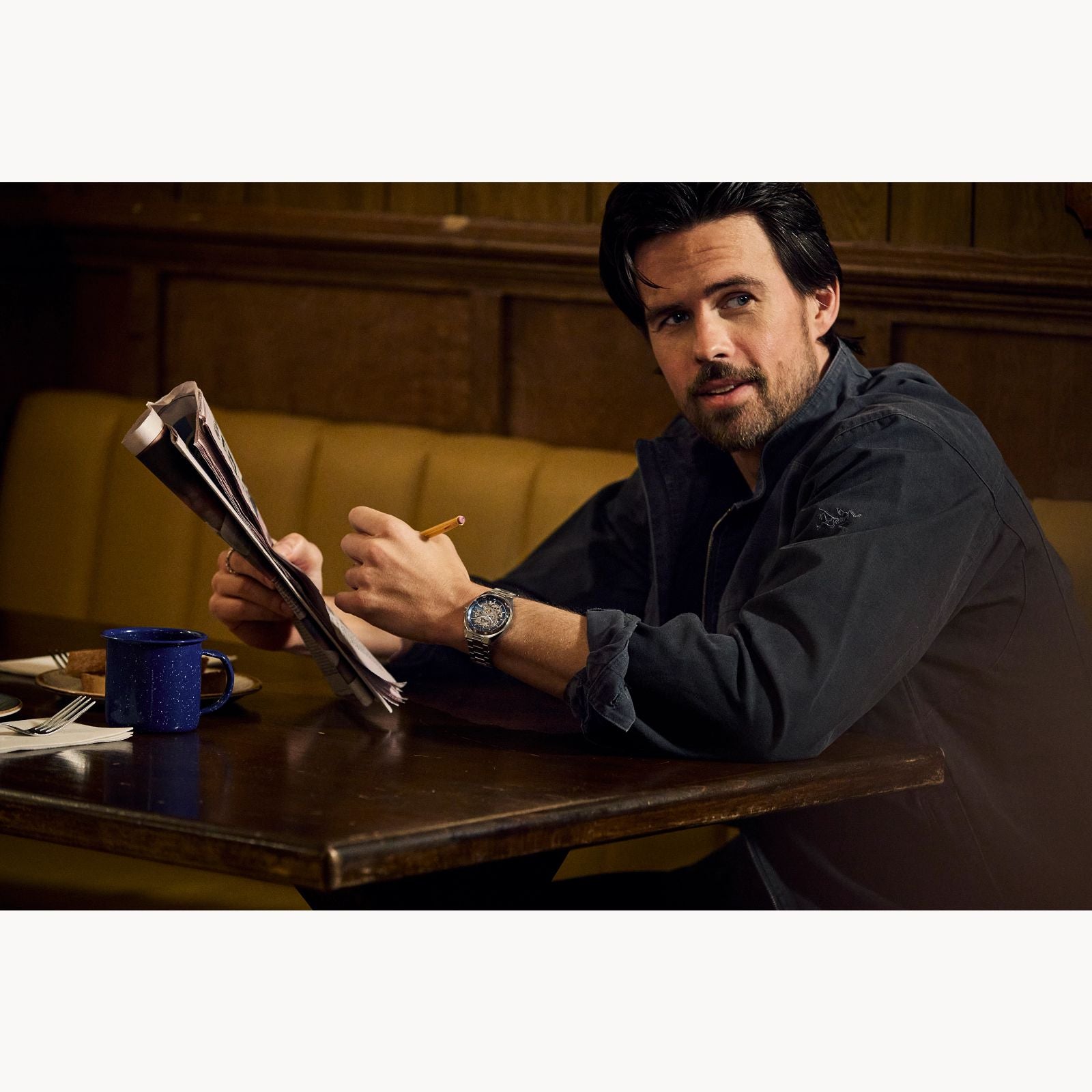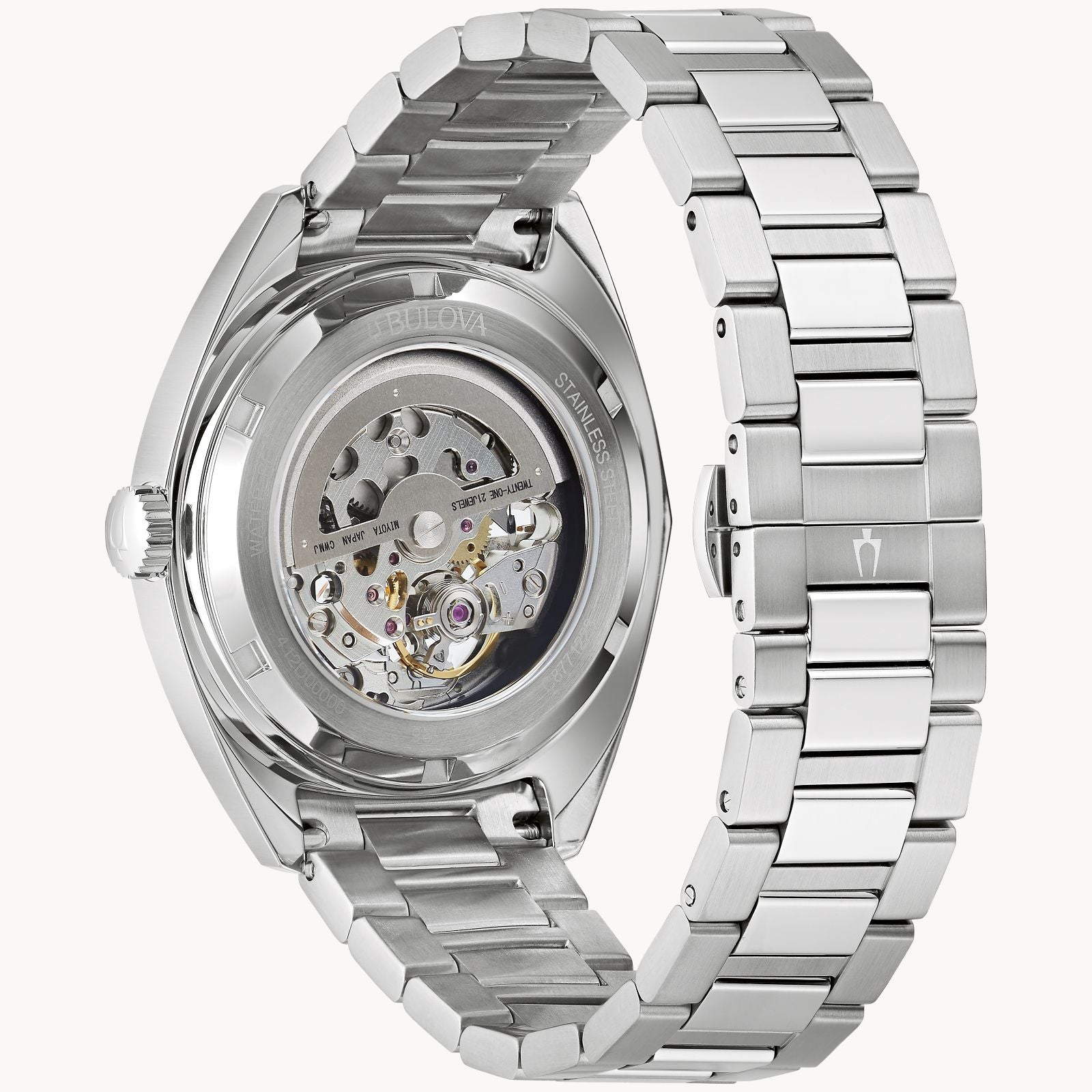 This new men’s automatic timepiece from the Bulova Surveyor collection offers modern design and luxurious craftmanship at an exceptional price. The contemporary stainless-steel case delivers an eye-catching brushed and polished surfaces with a subtle angularity and a domed mineral crystal. The remarkable dial is dominated by the display of the skeletonized automatic 21-jewel movement, which features a 42-hour power reserve. Surrounding the dial is a blue chapter ring with applied hour indices, which is complemented by angular hands with luminescent fill. The watch is paired with a matching stainless-steel bracelet for a seamless look on the wrist. With a captivating dial and appealing design, this watch is the perfect timepiece for everyday style.