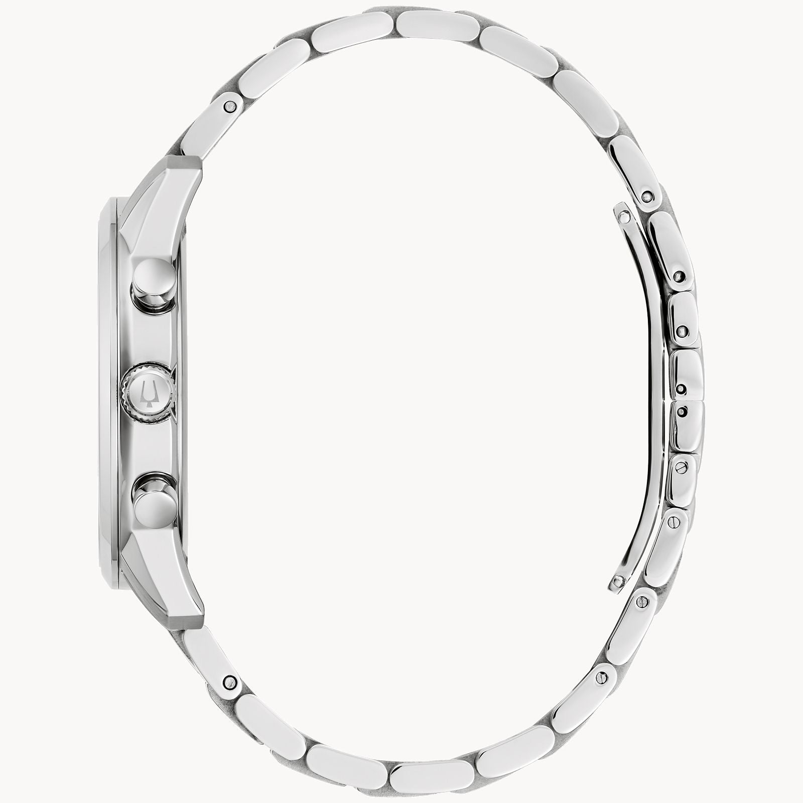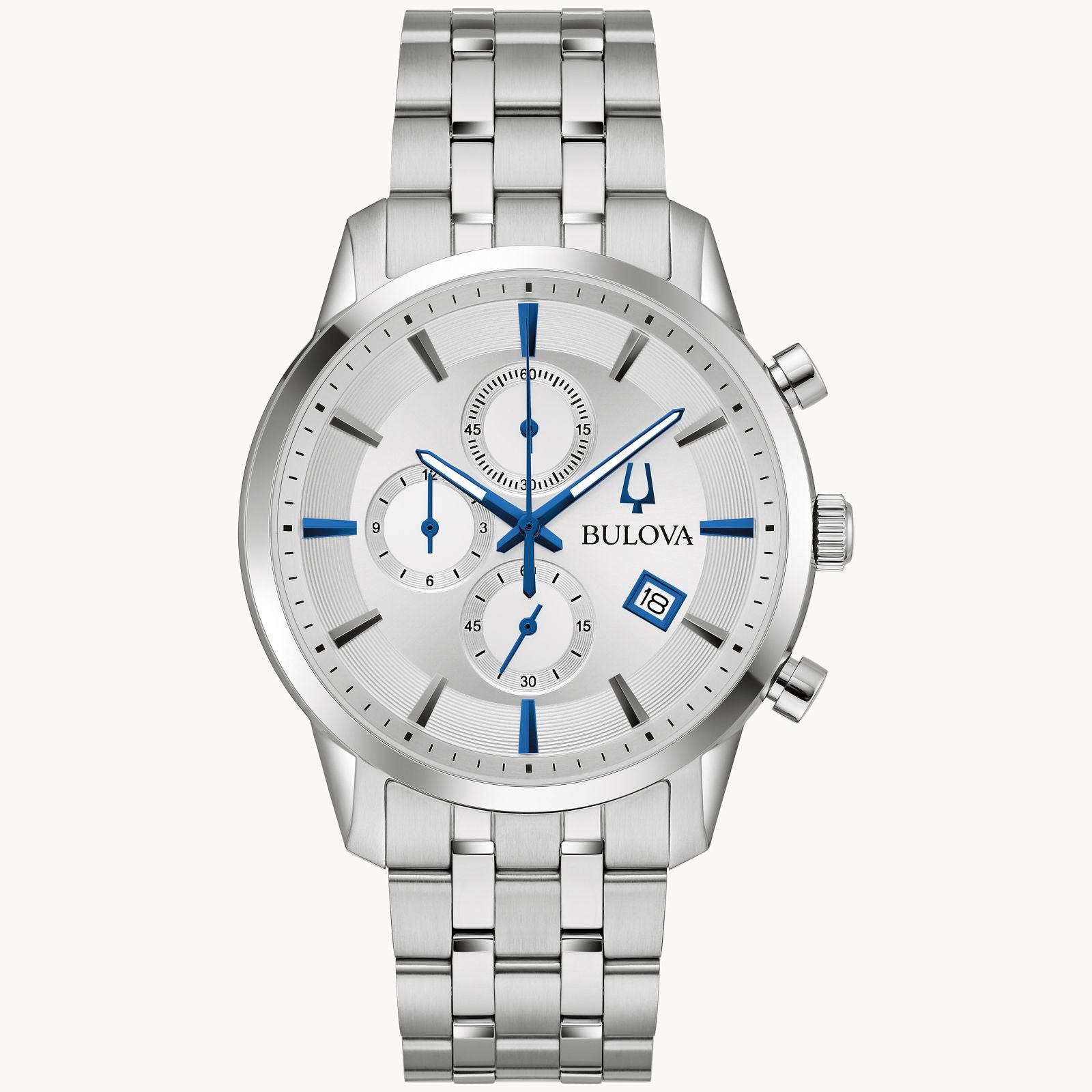 Timeless design and modern functionality define this new 6-hand Bulova men’s chronograph from the Sutton Collection. A silver-tone stainless steel case with a blend of brushing and polishing offers a sophisticated aesthetic and features classically styled chronograph pushers and a domed mineral crystal. A sleek silver-tone dial features applied black and blue hour markers against a circular grooved track, luminescent blue hour and minute hands, and a date display. The chronograph can time events up to 12 hours to the nearest second. For a seamlessly elegant look, the watch is paired with a silver-tone stainless steel multilink bracelet with a deployant closure. Elevate your wardrobe with design that never goes out of style with this new Bulova men’s chronograph timepiece from the Sutton Collection.