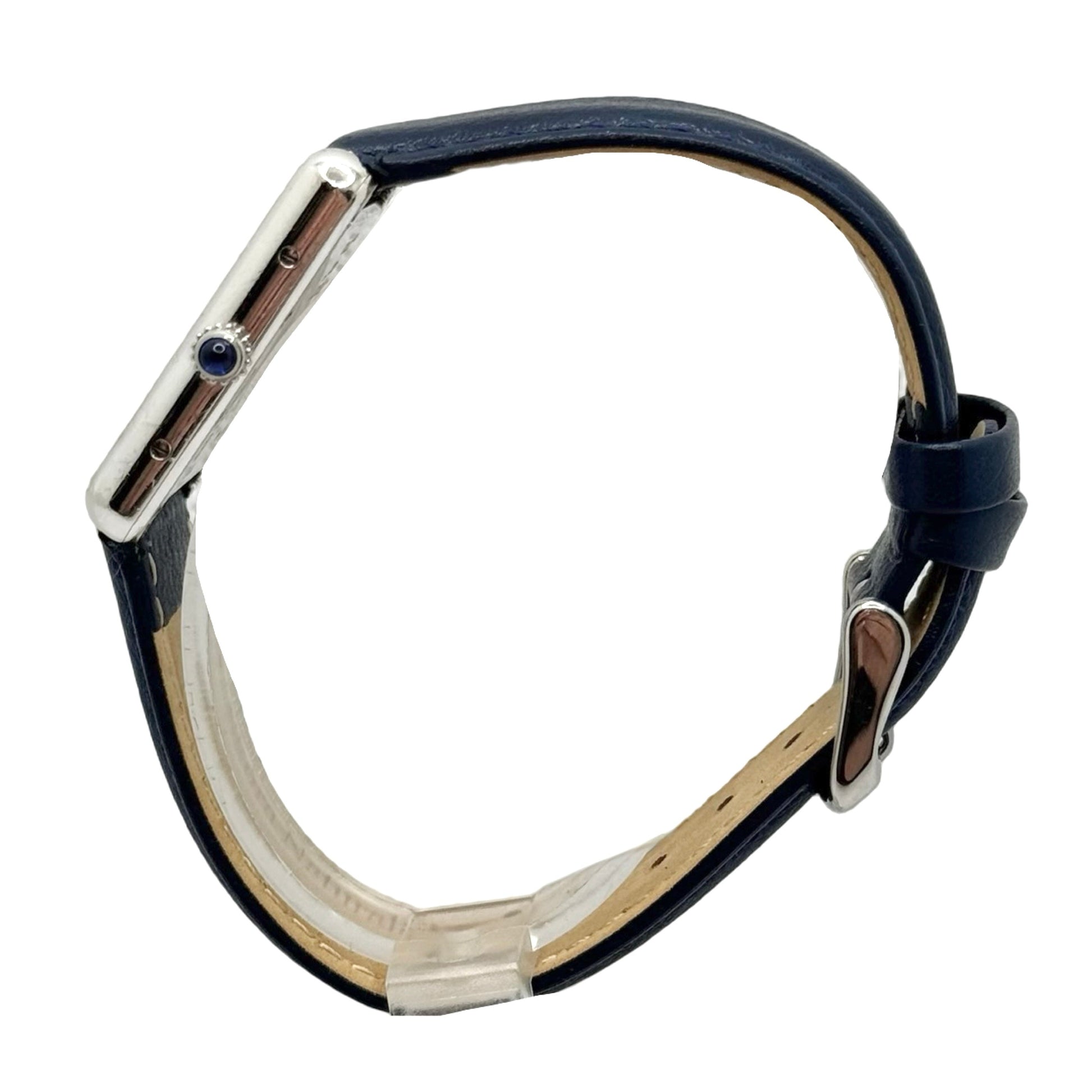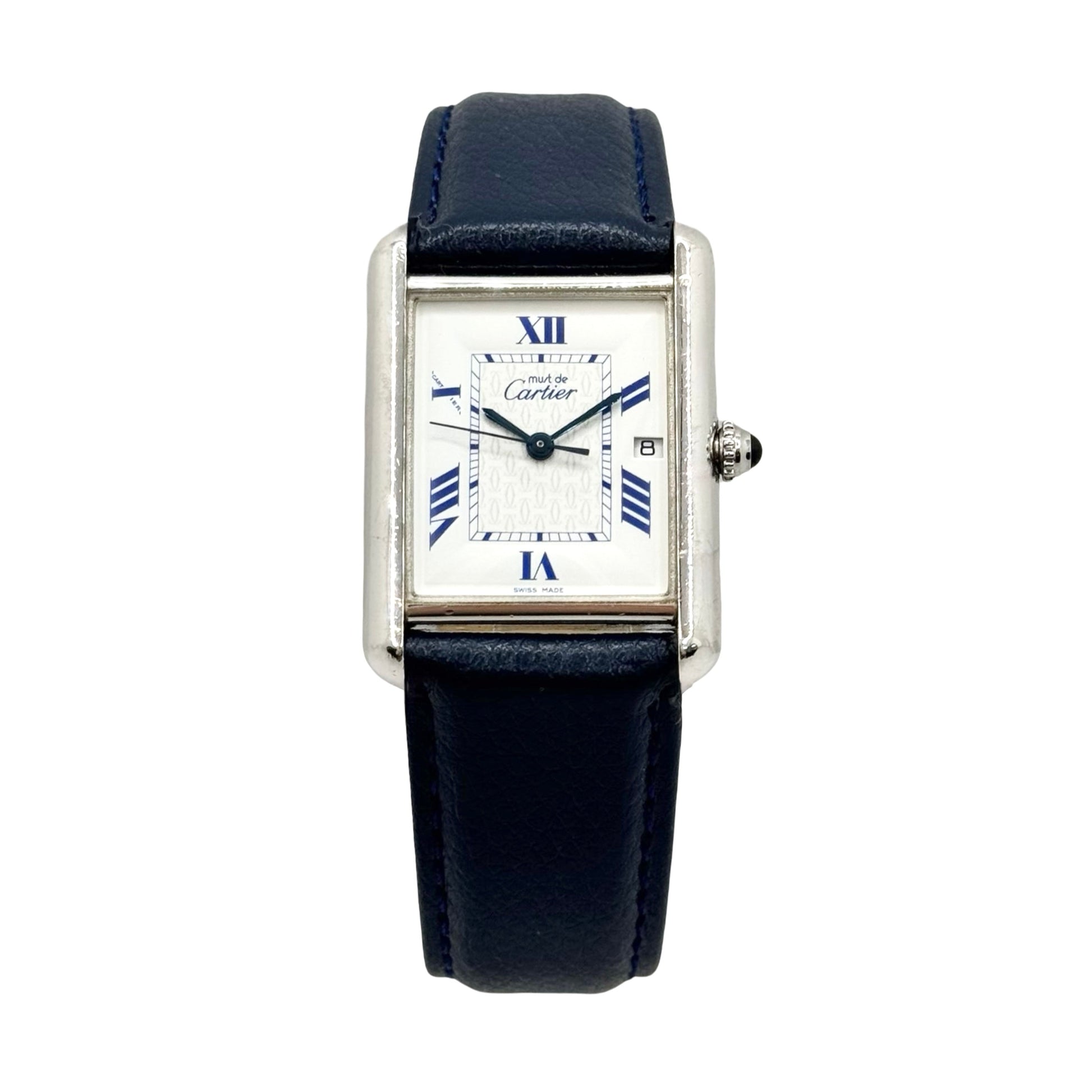 Dial: White with blue Roman numerals, a detail not commonly seen on Cartier Tanks. It also has a subtle "pie-pan-esque" design around the hands' axis, adding depth, along with the iconic "double C" Cartier logos and a train-track minute track