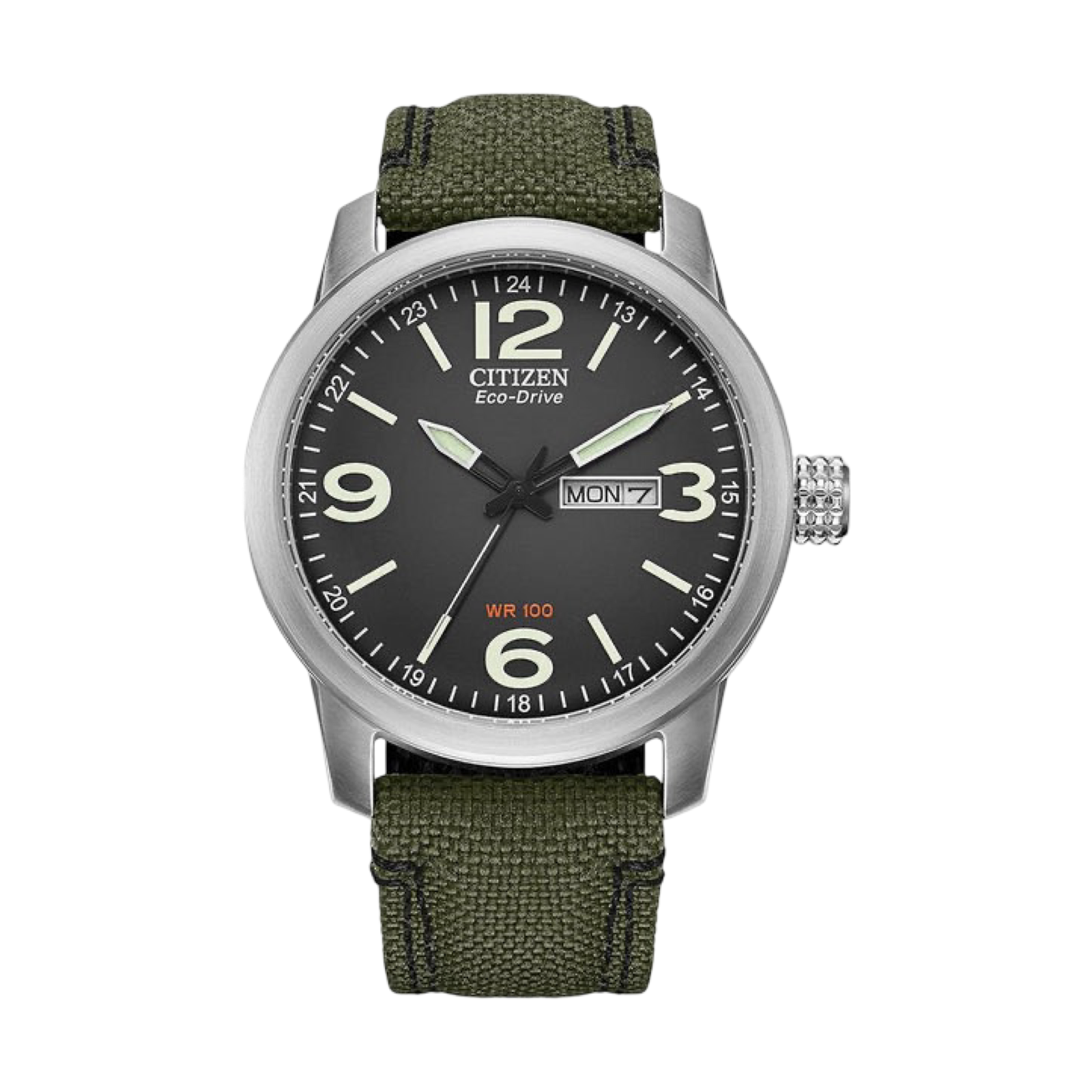 The rugged design of this military-inspired watch is guaranteed to get you noticed. Key features include day-date, luminous hour and minute hands and 100 meter water resistance. Additional details include bold numerals on a charcoal dial, stainless steel with a green strap, and 42mm screw-back case. Featuring our Eco-Drive technology – powered by light, any light. Never needs a battery. Caliber number E101.