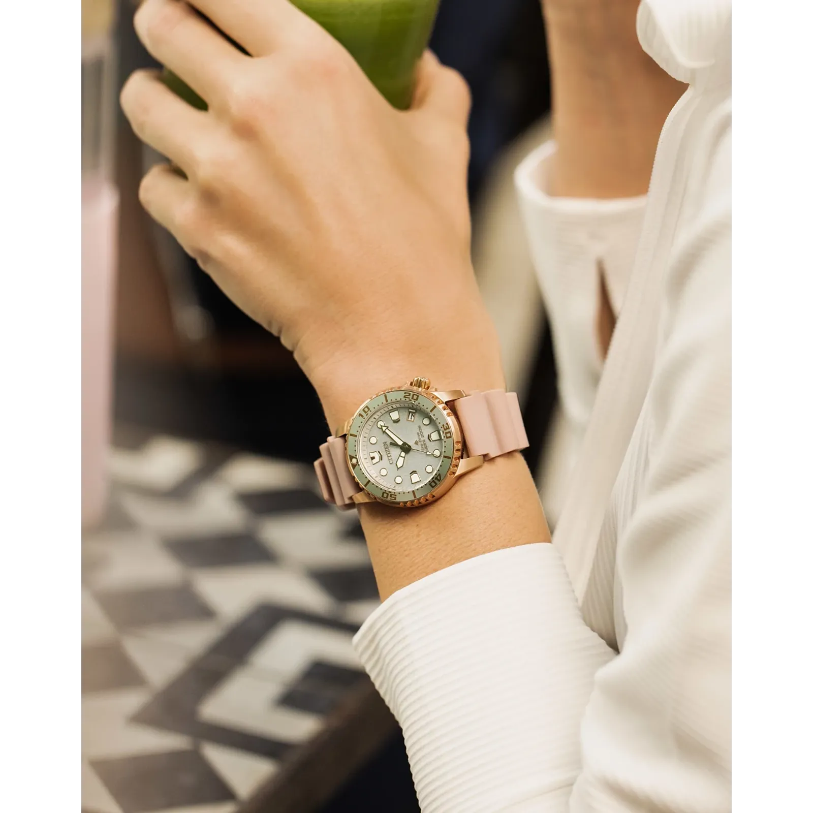Submerge yourself in the latest Dive watch to join Citizen’s innovative Promaster line. The new timepiece features a smaller, versatile 37mm case size with a rose gold-tone stainless steel exterior complete with an easy-grip dive bezel and screw-down crown at 4 o’clock, with the bold design secured to the wrist via a blush-tone polyurethane strap. The striking white dial features oversized hands and applied markers that add to its high legibility, while accents of more rose gold hues and a bright luminous material ensure sleek styling and quick readability to even the deepest depths. At the 4 o’clock position is a thoughtful date window, adding another element of functionality to this all-purpose diver. Maintaining the robust standards of the Promaster Collection, the timepiece is water resistant up to 200 meters. Sustainably powered by any light with Eco-Drive technology that never needs a battery, this stylish dive watch also comes in an exclusive collector’s scuba tank-inspired box. Caliber E168.