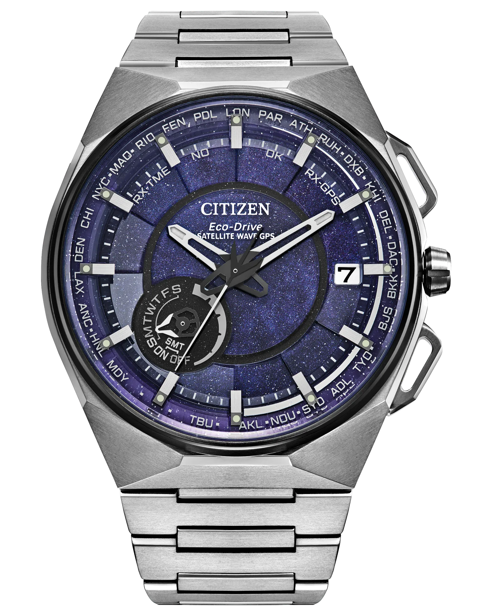 Marking ten years since the launch of the original F100 models in 2014, Citizen now introduces the Satellite Wave. Inspired by artificial satellites and the infinite expanse of space, the new watch matches future-cool styles with the world's fastest timekeeping signal reception speed from GPS navigation. A 45.4mm Super Titanium™ case and bracelet solidify the distinct integrated construction of the timepiece, while a duo of pushers and a conical crown provide a sporty and avant-garde touch. A world time bezel frames the cosmos-inspired dial, with black and applied silver-tone accents adding dimensionality alongside the utility of the watch's feature-packed sub-dial and date window.