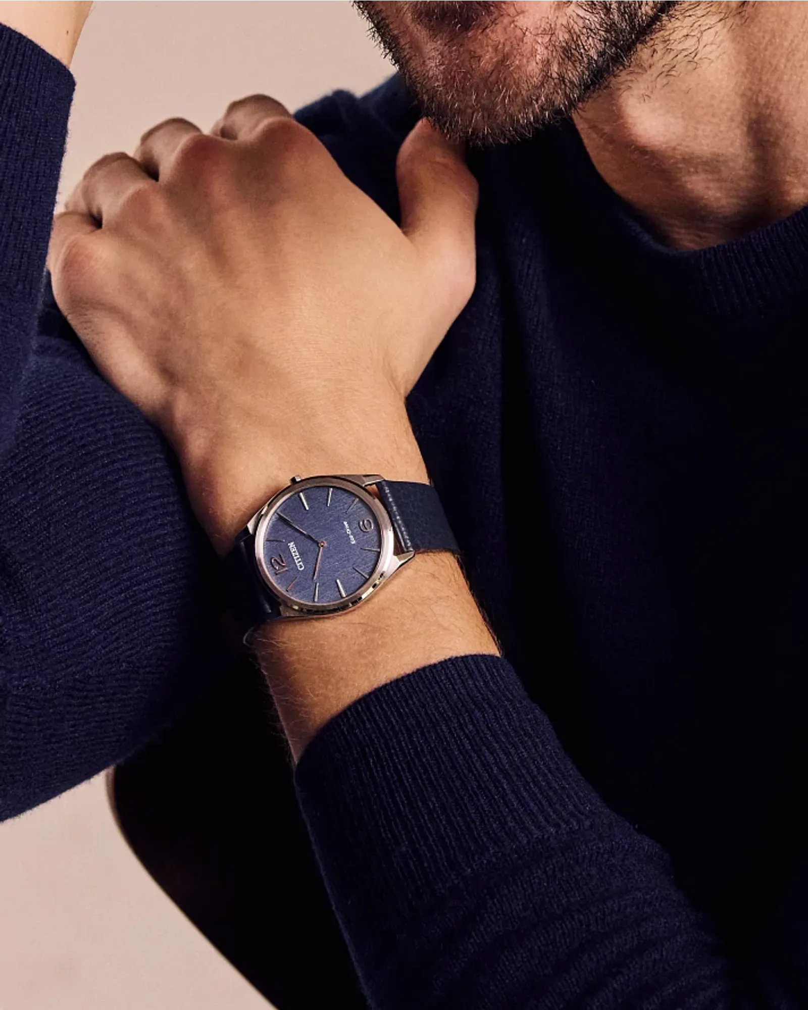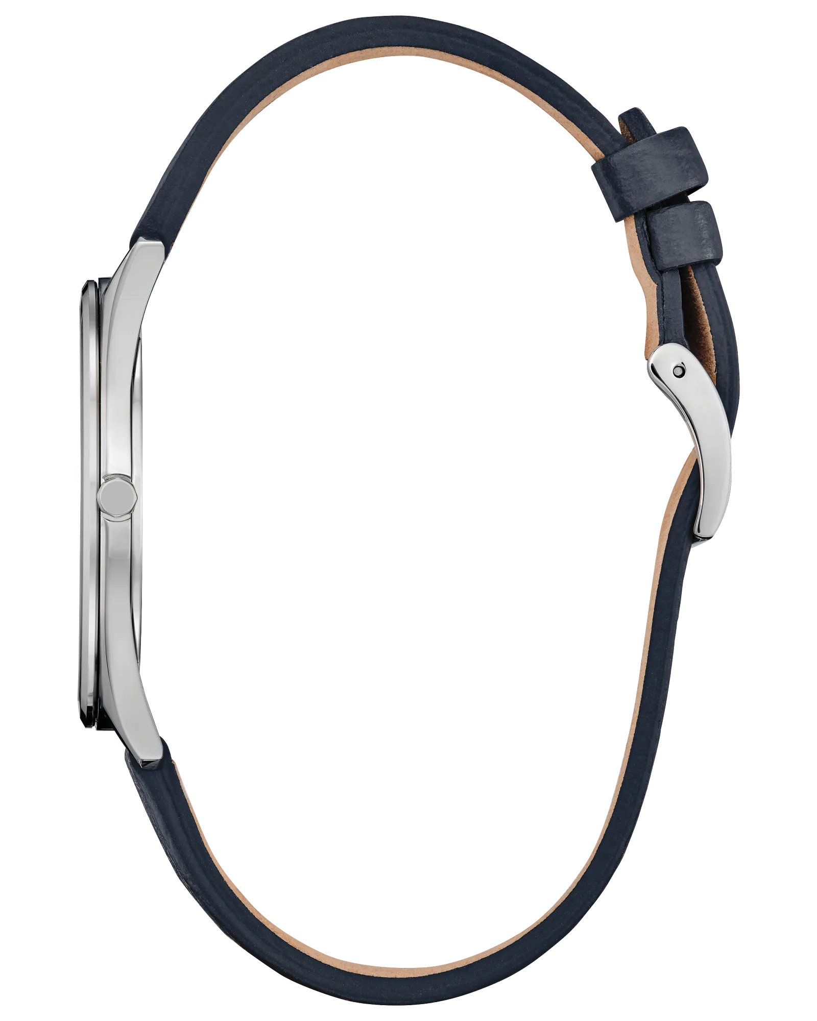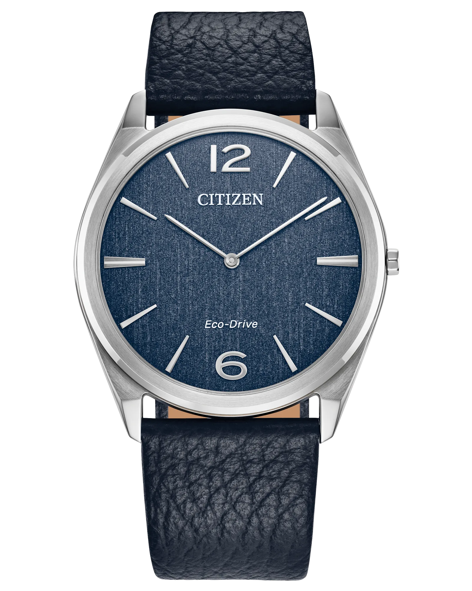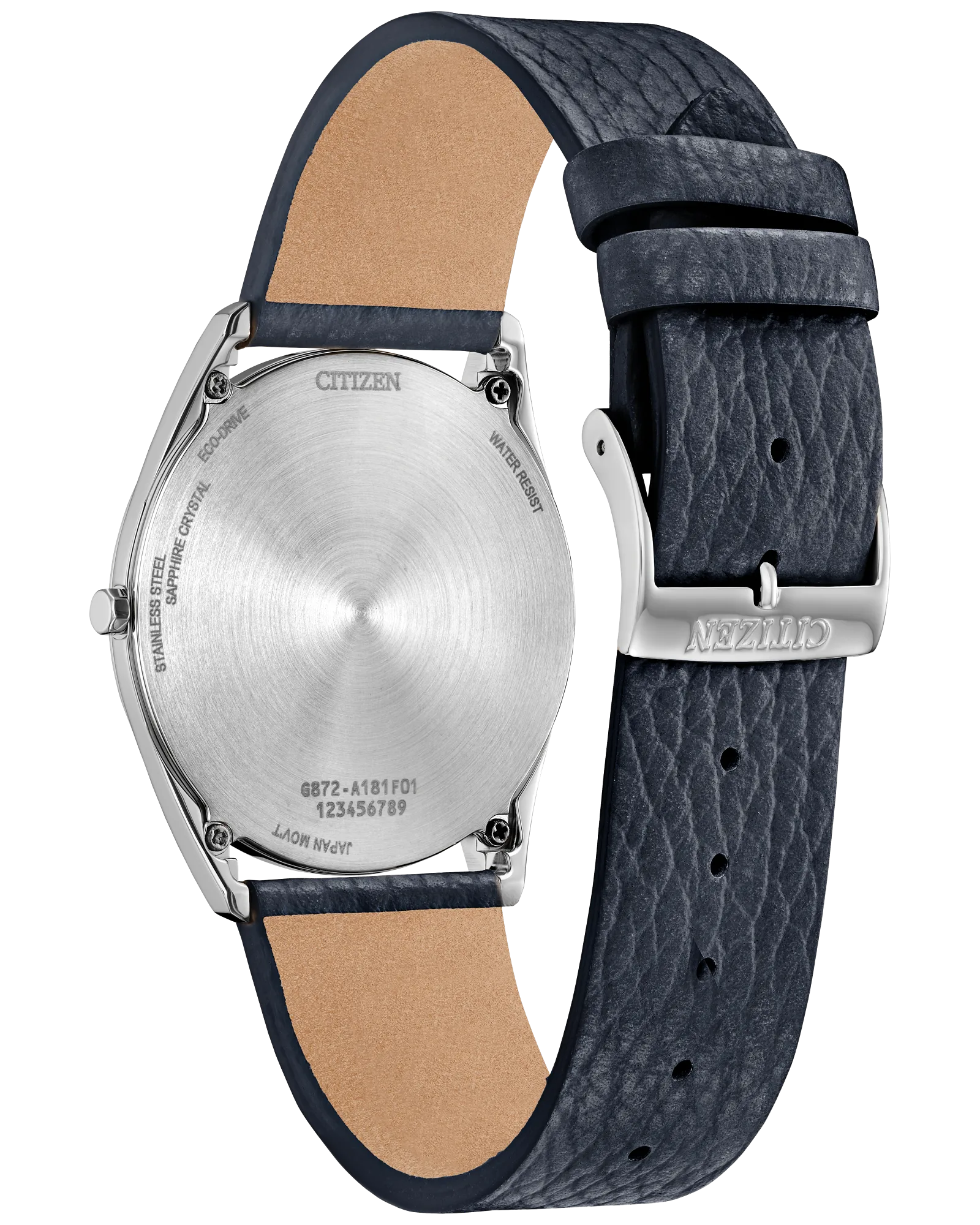 Classic lines and a simple silhouette define the newest addition to the Classic collection. This all-purpose dress watch features a versatile silver-tone stainless steel 38.4mm case, a two-hand blue dial featuring an entrancing metallic powder aesthetic with silver-tone hands and markers, and is secured to the wrist via a grained blue leather strap with buckle closure. The Citizen Suratto collection features a notably defining thin case at 4.71mm, and is sustainably powered by any light with Eco-Drive technology --which never needs a battery. Water resistant to 30 meters. Caliber G872.