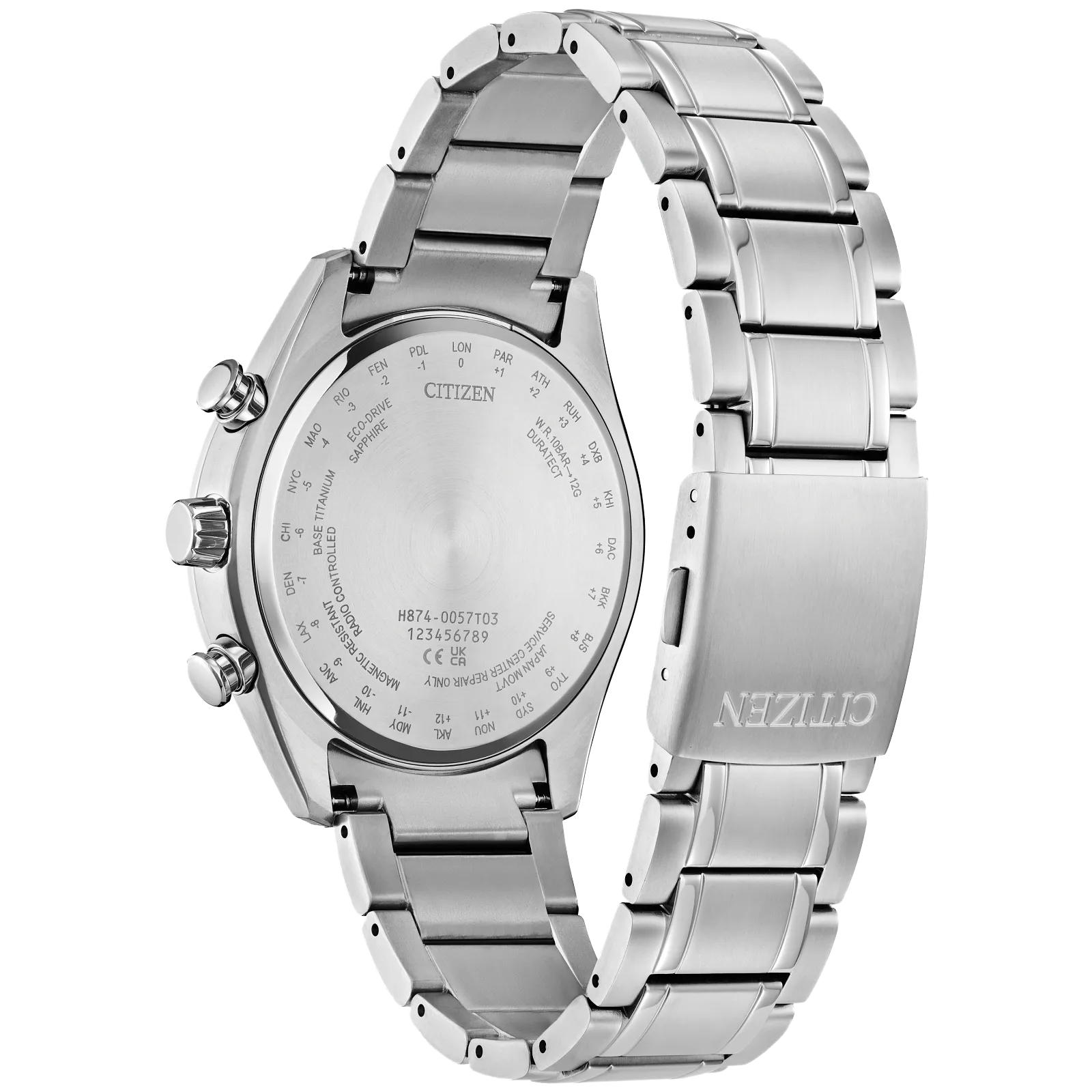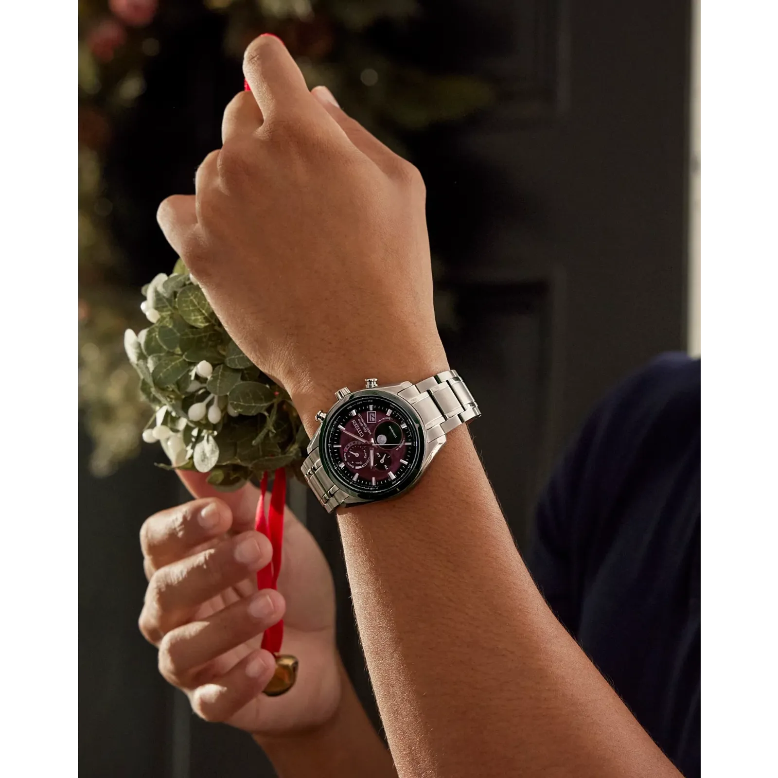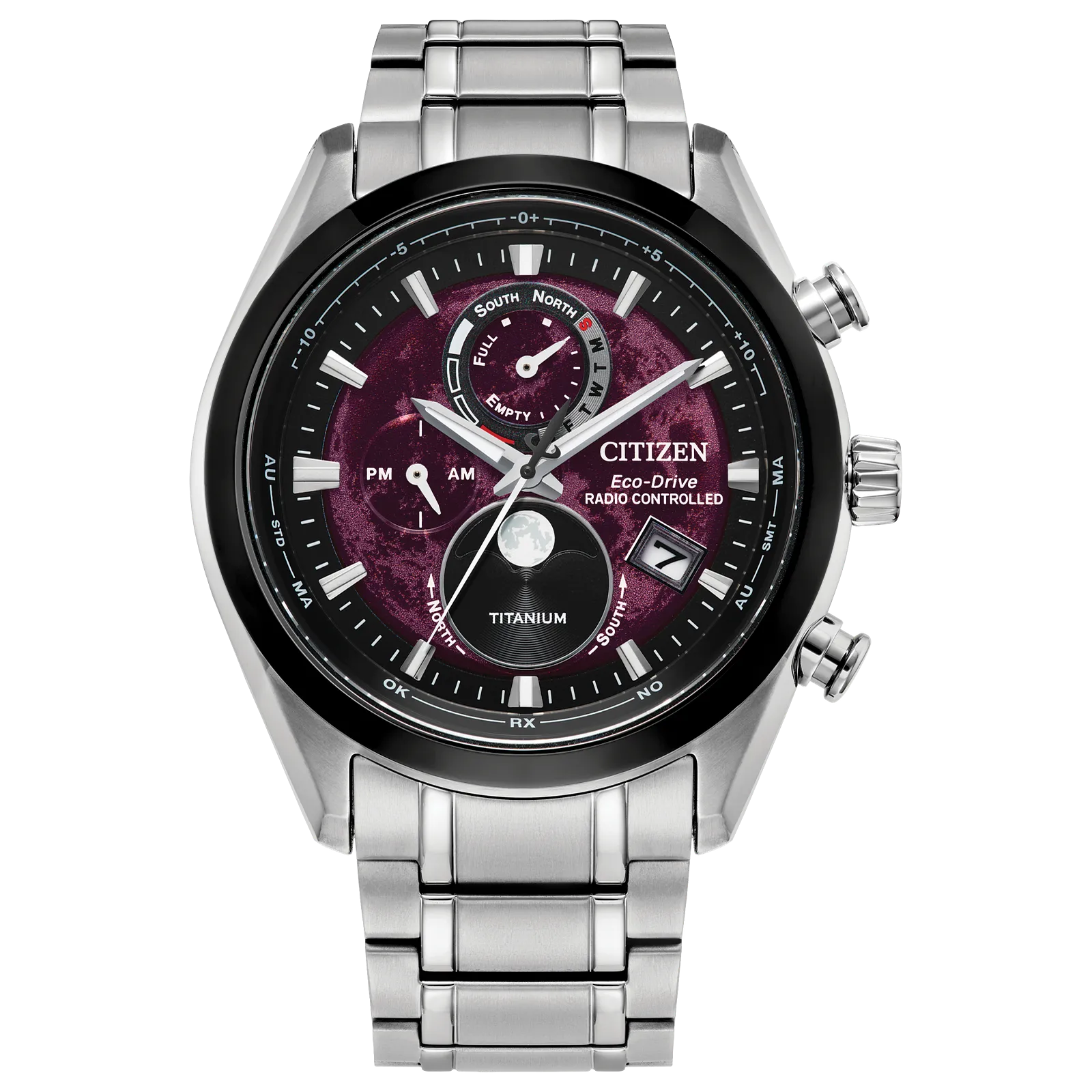 When breakthrough technology and spectacular design meet, the Tsuki-yomi A-T is reading the moon. It’s the world’s first moonphase watch combined with atomic timekeeping innovation from Citizen, and this 30th Anniversary model is nothing short of impressive. The styling embodies the moon’s surface and a window at 6 o’clock displays the current moon phase. The timepiece measures 43mm in a silver-tone Super Titanium™ case, where sharp faceted edges pair with an elevated design throughout for an eye-catching aesthetic on the wrist. The deep red dial works in tandem with black accents and silver-tone touches for a display that’s as handsome as it is legible. In addition to its running time, the watch features a moon phase display, world time in 24 time zones, a perpetual calendar, and a day-date functionality. Powered by Citizen’s proprietary Eco-Drive technology to provide light-powered vitality without ever needing a battery. Water resistant up to 100 meters. Caliber H874.