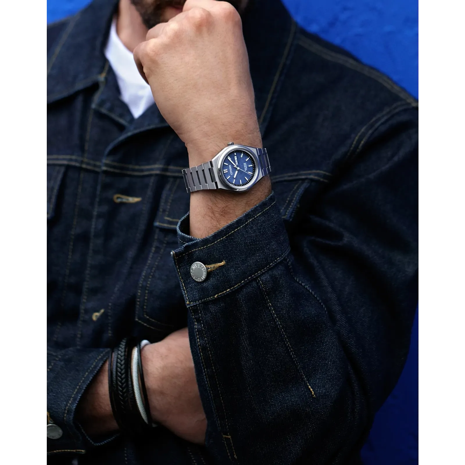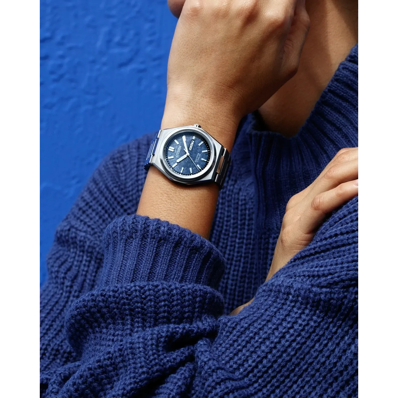 Pairing classic proportions and innovative technology with a distinctly modern style, we present our new Integrated Super Titanium™ series. Made with our proprietary material, Super Titanium™, which is five times harder and 40% lighter than stainless steel and is scratch- and rust-resistant, this sporty timepiece features a 39mm silver-tone Super Titanium™ case that is elevated with finely brushed and polished finishing while being secured to the wrist with an integrated matching bracelet. On the dial, a textured blue color is accented with an outer minute ring in black, with silver-tone details and luminous hands and markers. A combined day-date window at the 3 o’clock position adds daily utility and hints at the watch’s retro-style inspirations. Sustainably powered by any light with Eco-Drive technology and never needing a battery, this versatile watch is also water resistant to 100 meters. Caliber J800.