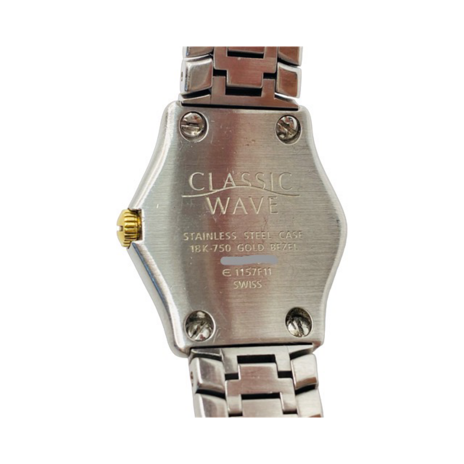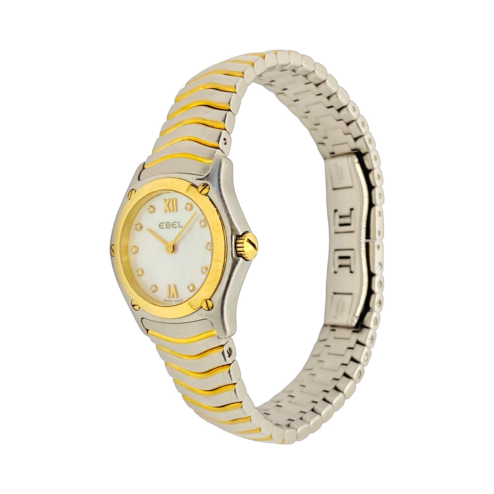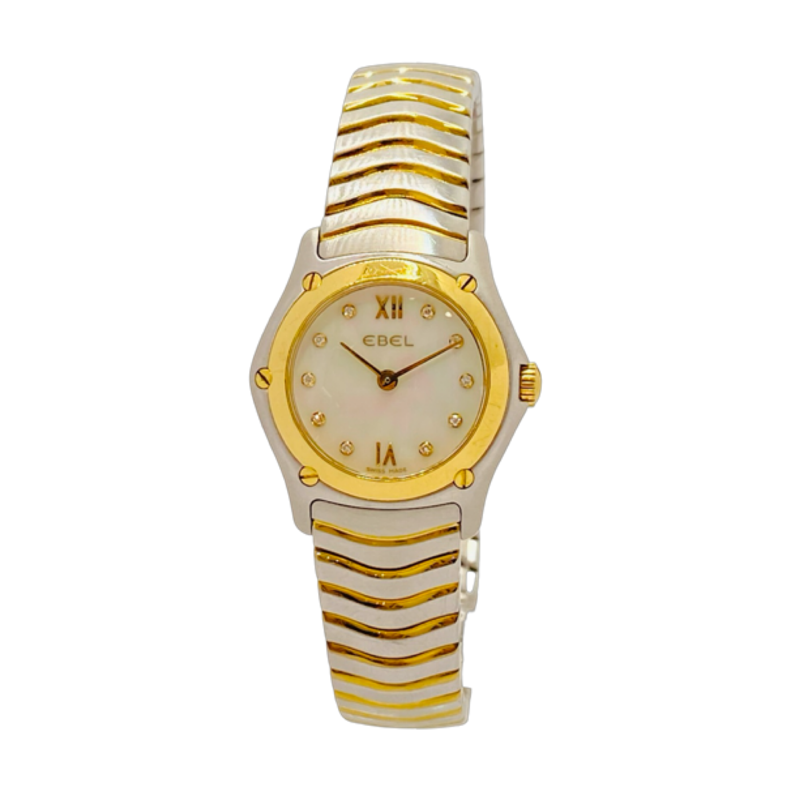 Women's EBEL Classic Wave watch, Mini Size, Stainless steel and 18K 3N yellow gold case, Ø 24mm, white mother-of-pearl dial with 3N yellow gold-plated Roman numerals and 10 diamonds, sapphire crystal with antireflective treatment underneath, two-tone stainless steel wave link bracelet with a folding clasp, Swiss quartz movement, water-resistant up to 50 meters