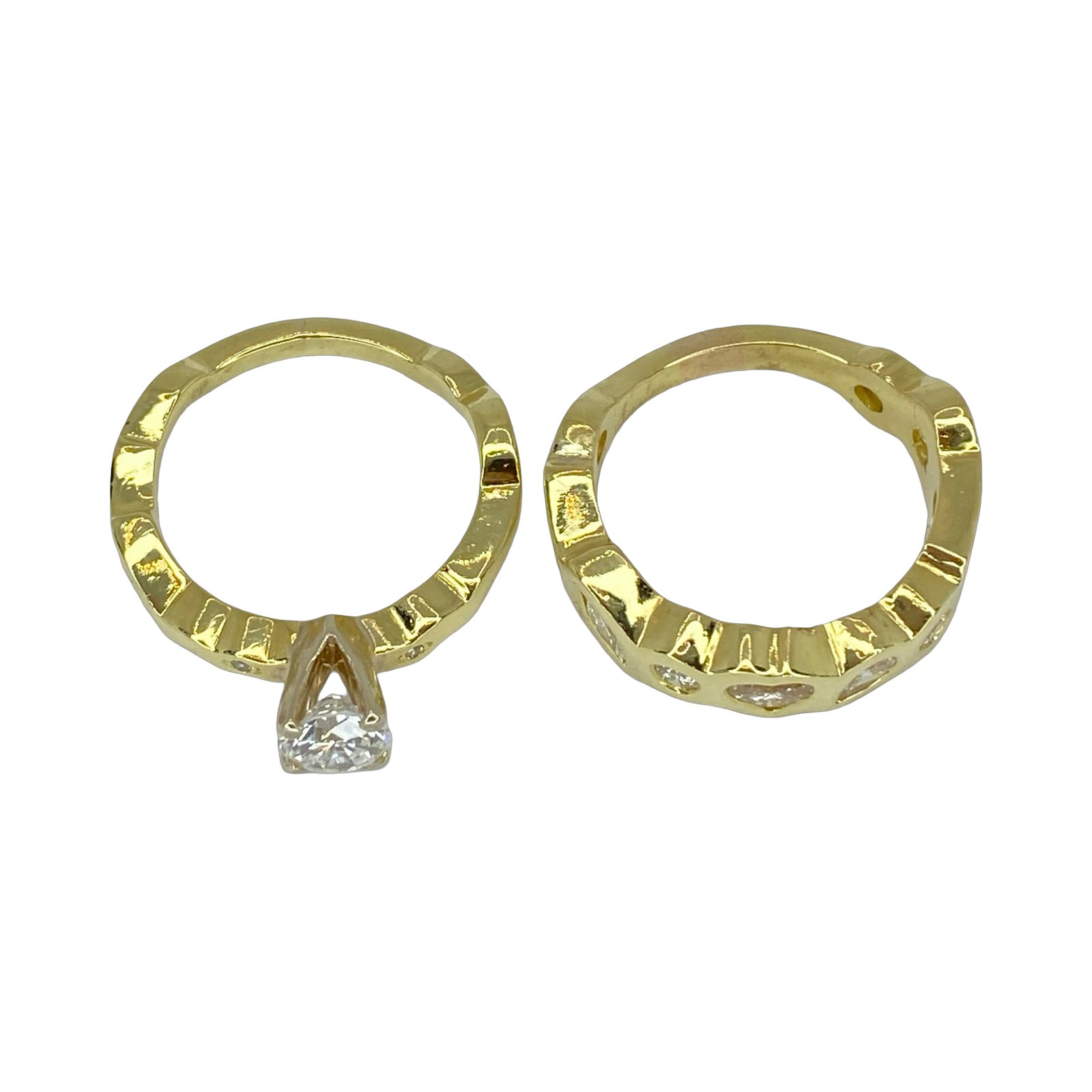This overall style emphasizes a natural, artisanal, and modern look that often appears bespoke or one-of-a-kind. the main ring has a round diamond that is mounted in a 4-prong setting. The matching band is an semi eternity-style ring with multiple mixed-shape diamonds (including heart and pear shapes) in flush setting within similarly irregular gold segments.