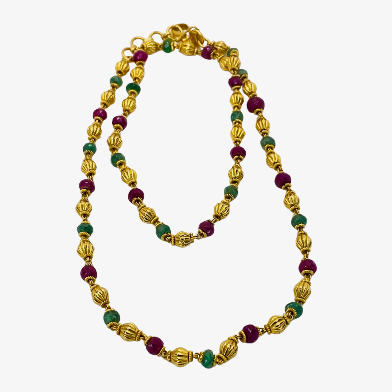 22K Yellow Gold Faceted Round Emerald & Ruby Necklace, Bi-cone Gold Beads and Spacers.