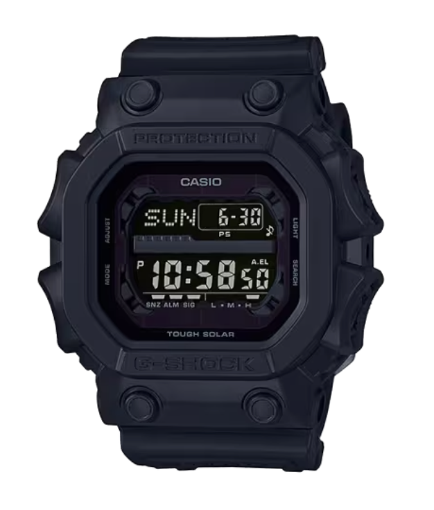 From G-SHOCK, the watch that sets the standard for timekeeping toughness, comes the latest models to feature basic G-SHOCK black that captures the essence of one-tone resin. This model is based on the GX-56, which is designed to withstand impact from any direction. A simple matte black finish allows the form of the watch itself to come out, while the buckle have a black ion plate finish. Everything about this new basic black model capture the very essence of the rough, tough basic G-SHOCK image.