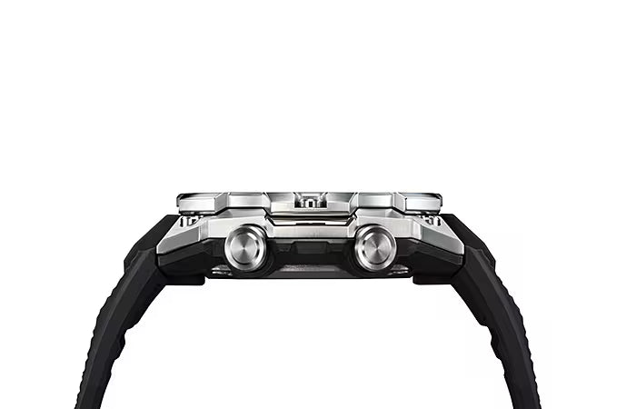 An ultra-thin module encased in carbon fiber makes for a stylish G-STEEL timepiece with the slimmest profile yet. Strong, yet lightweight, the carbon core guard structure absorbs external shocks and retains Bluetooth connectivity and solar power functionality even with smaller components and a thinner module. Measuring just 12.9mm from the back of the case to the top of the bezel, the GST-B400 is over a millimeter thinner than its predecessor . Your choice of four distinctive styles—the simplicity of a silver metal band and silver case; light silver case set against dark resin band; dial in dramatic red vapor deposition finish paired with a black ion-plated bezel; or dial in bold blue vapor deposition finish with black ion-plated bezel and band. With top bezels treated with five different finishes and middle bezels treated with four, these G-STEEL timepieces deliver exceptional metal textures from every angle. * Slimmest profile as of December 2020