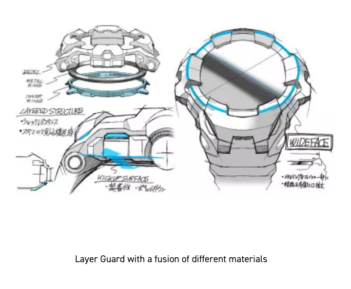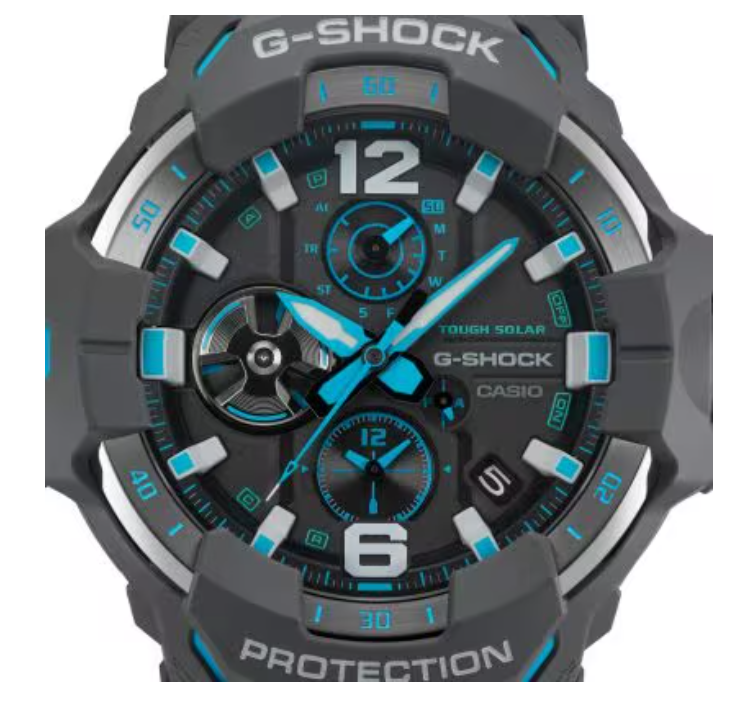 Next-generation aircraft sport seamless-edge designs, and the bezel and case of the GRAVITYMASTER GRB300-8A2 pilot watch utilize that seamless-edge concept. The nonstandard bezel couples with a triple-layer dial to create a 3-D watch face with raised indices. The blue accents on the indices and hands craft an effect like a HUD. Taken altogether, the watch face is a cinch to read, giving you the critical information you need at a glance.