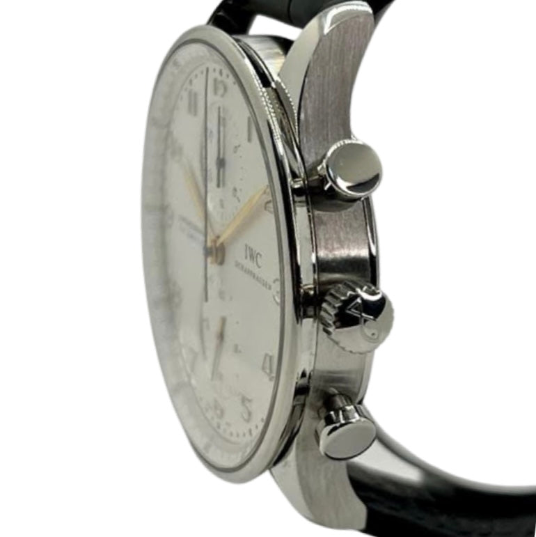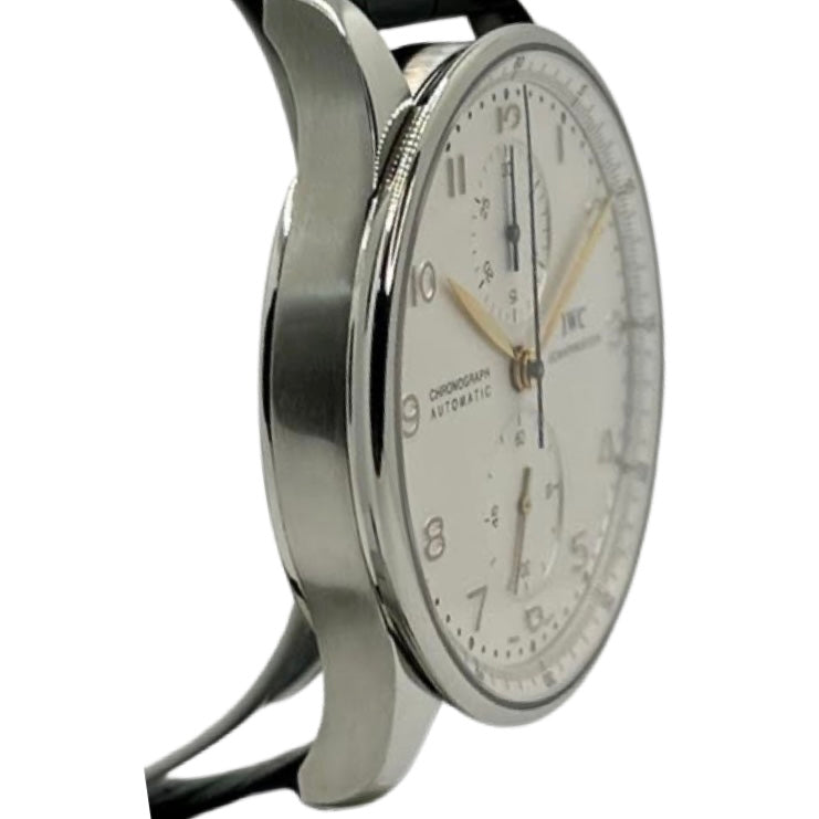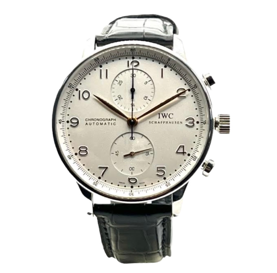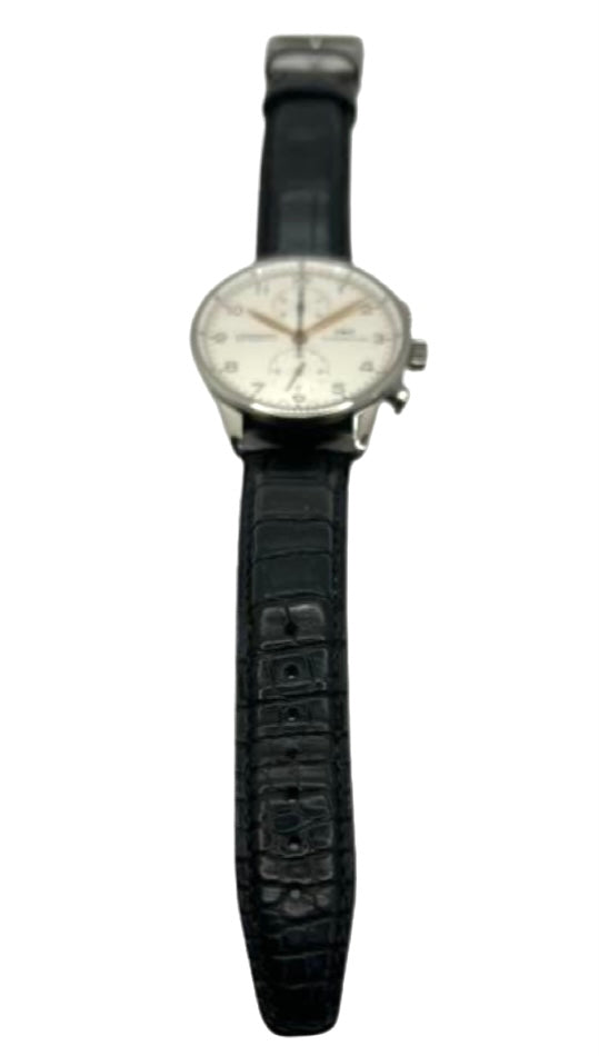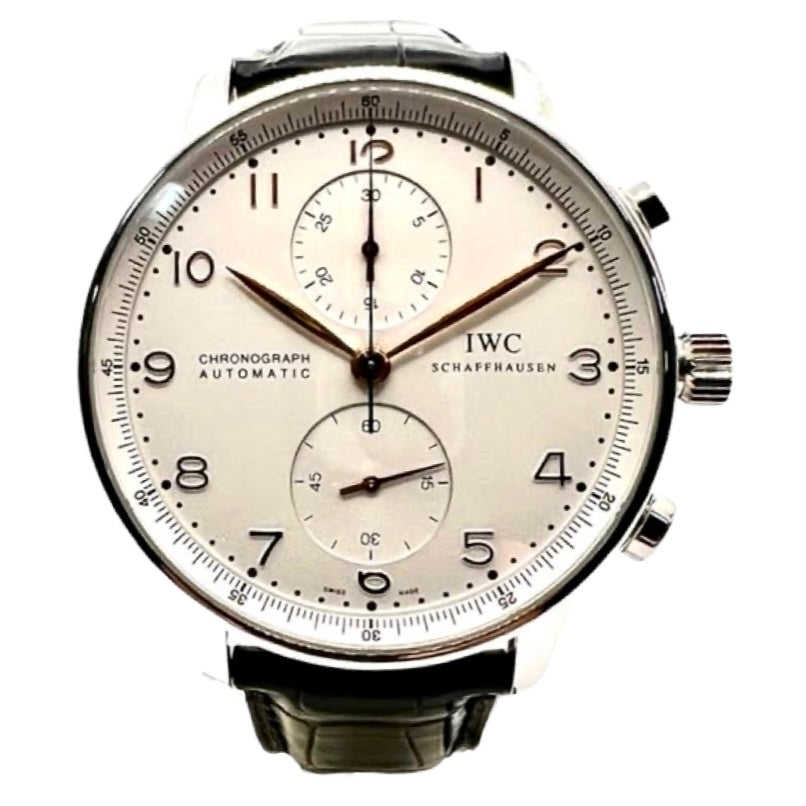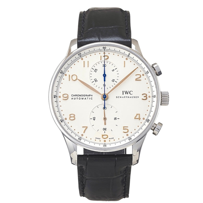 White Dial, Rose Gold Minute, hour, Central Chronograph Seconds hand, small sub seconds, 30 minute Chronograph Totalizer, Rose Gold applied Arabic numeral indices