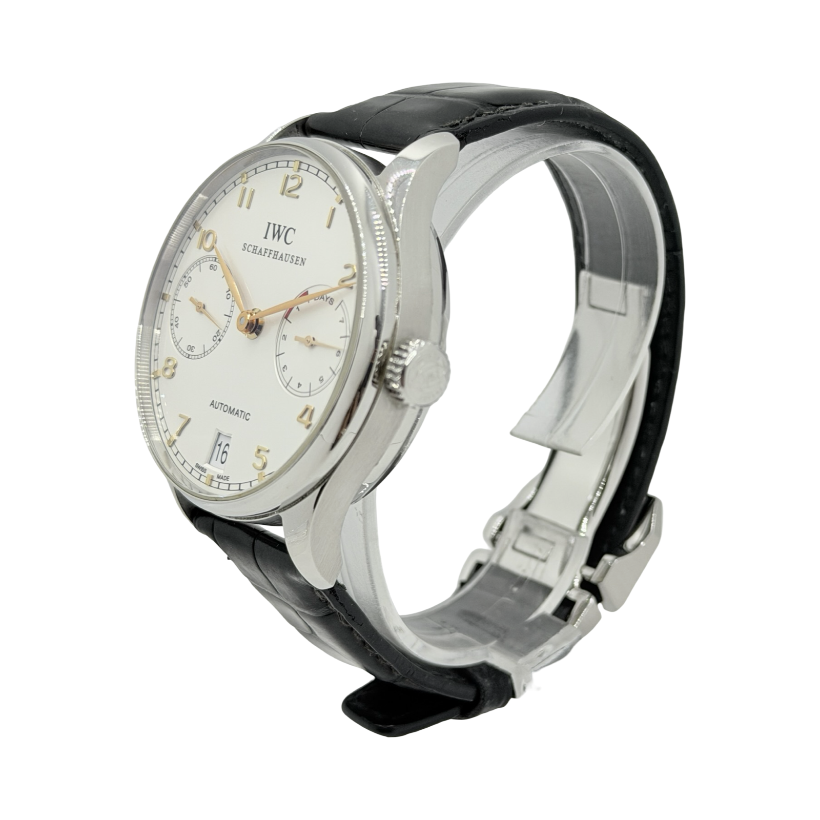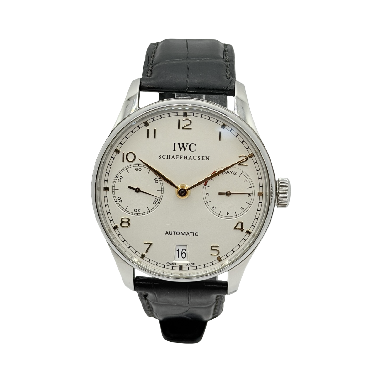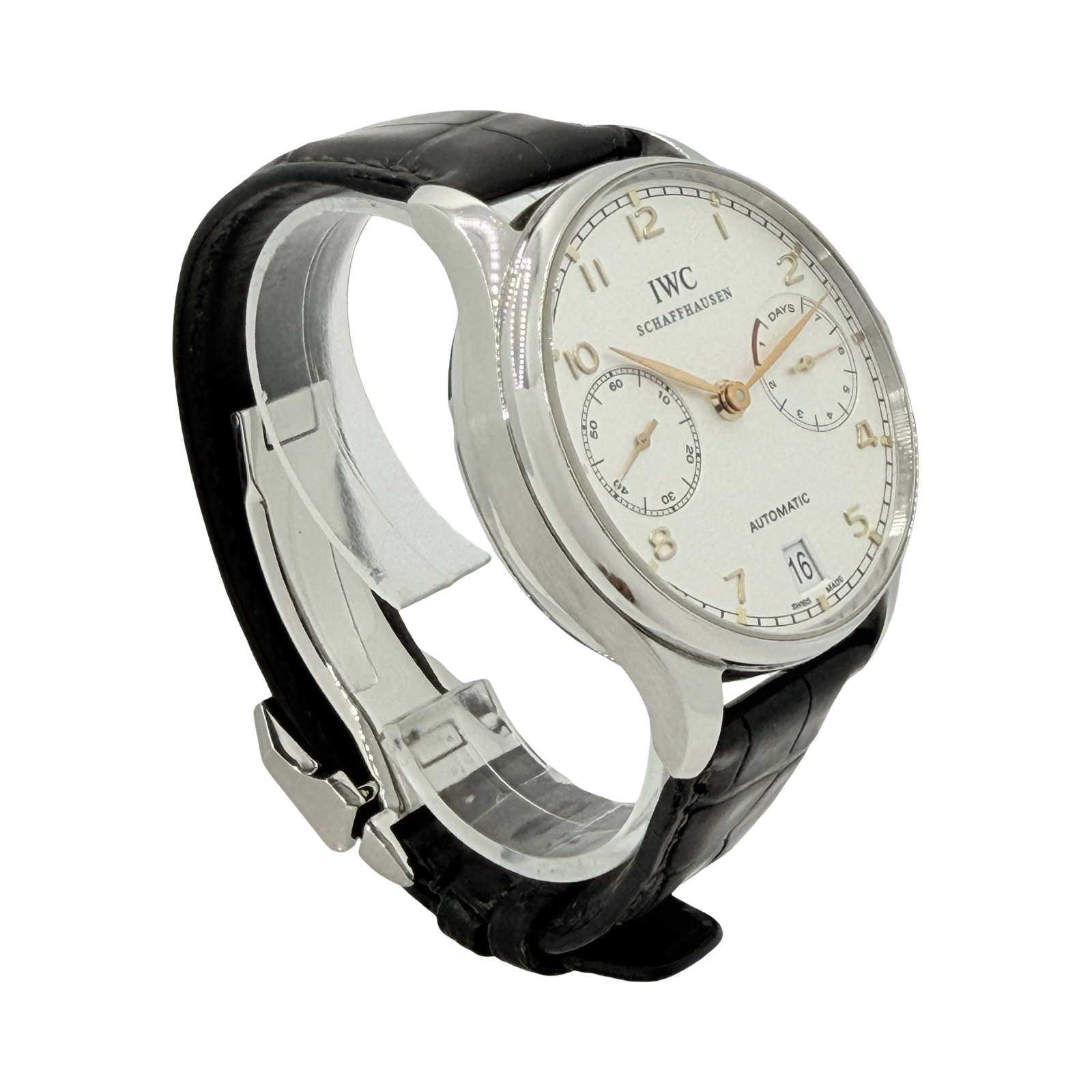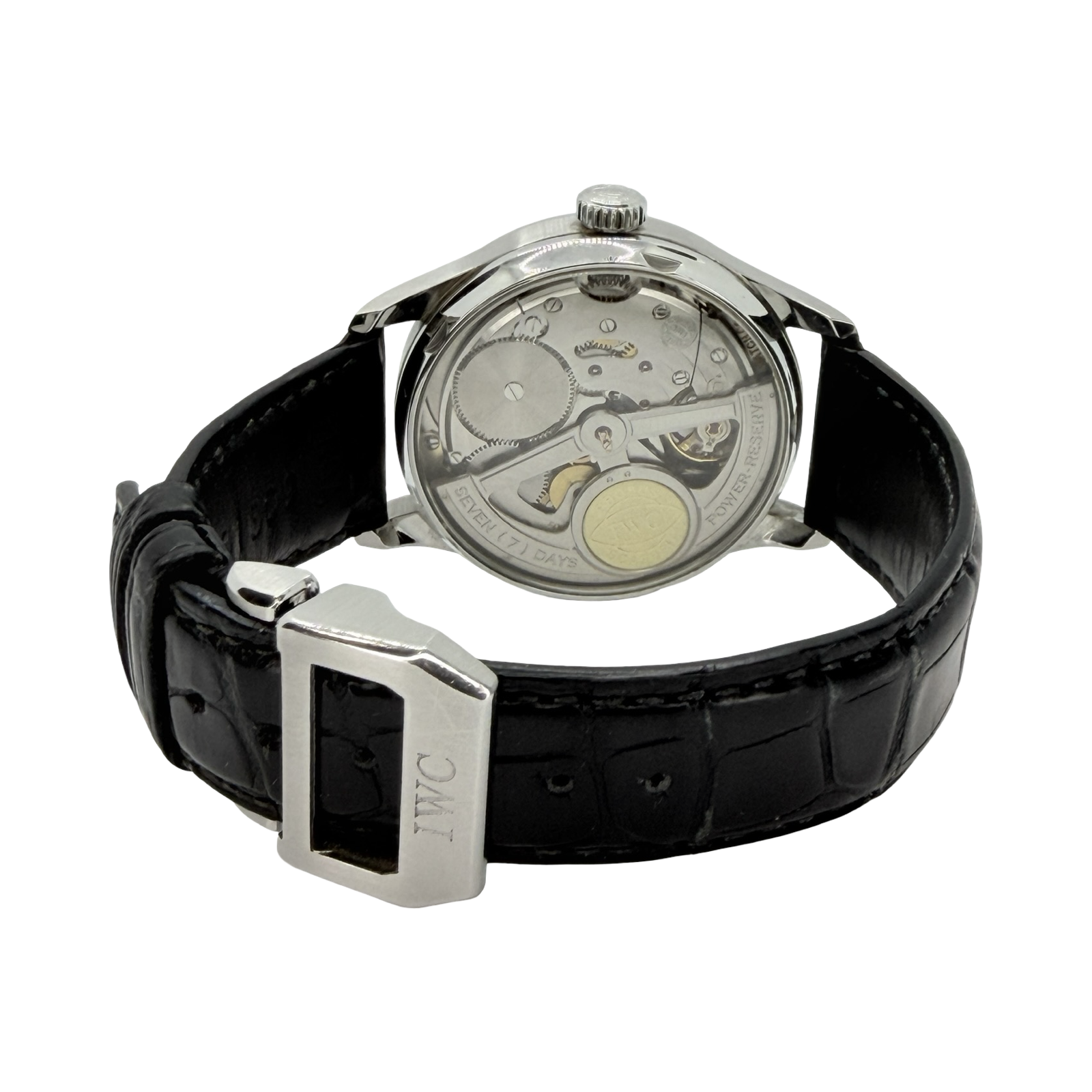 IWC Schaffhausen Portugieser 7 Day Power Reserve Silver Dial Black Leather Strap IW500114