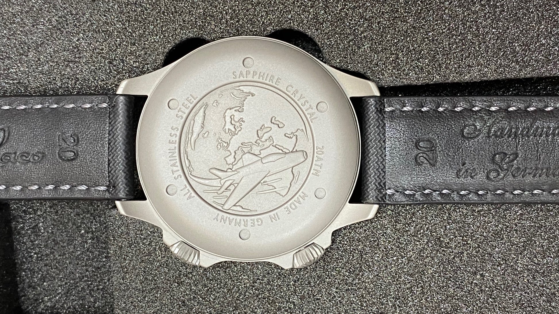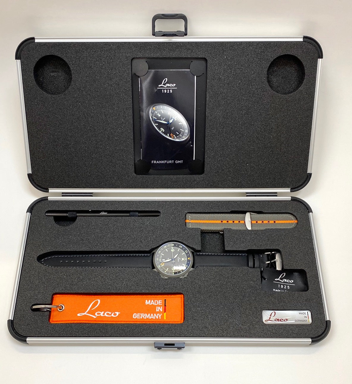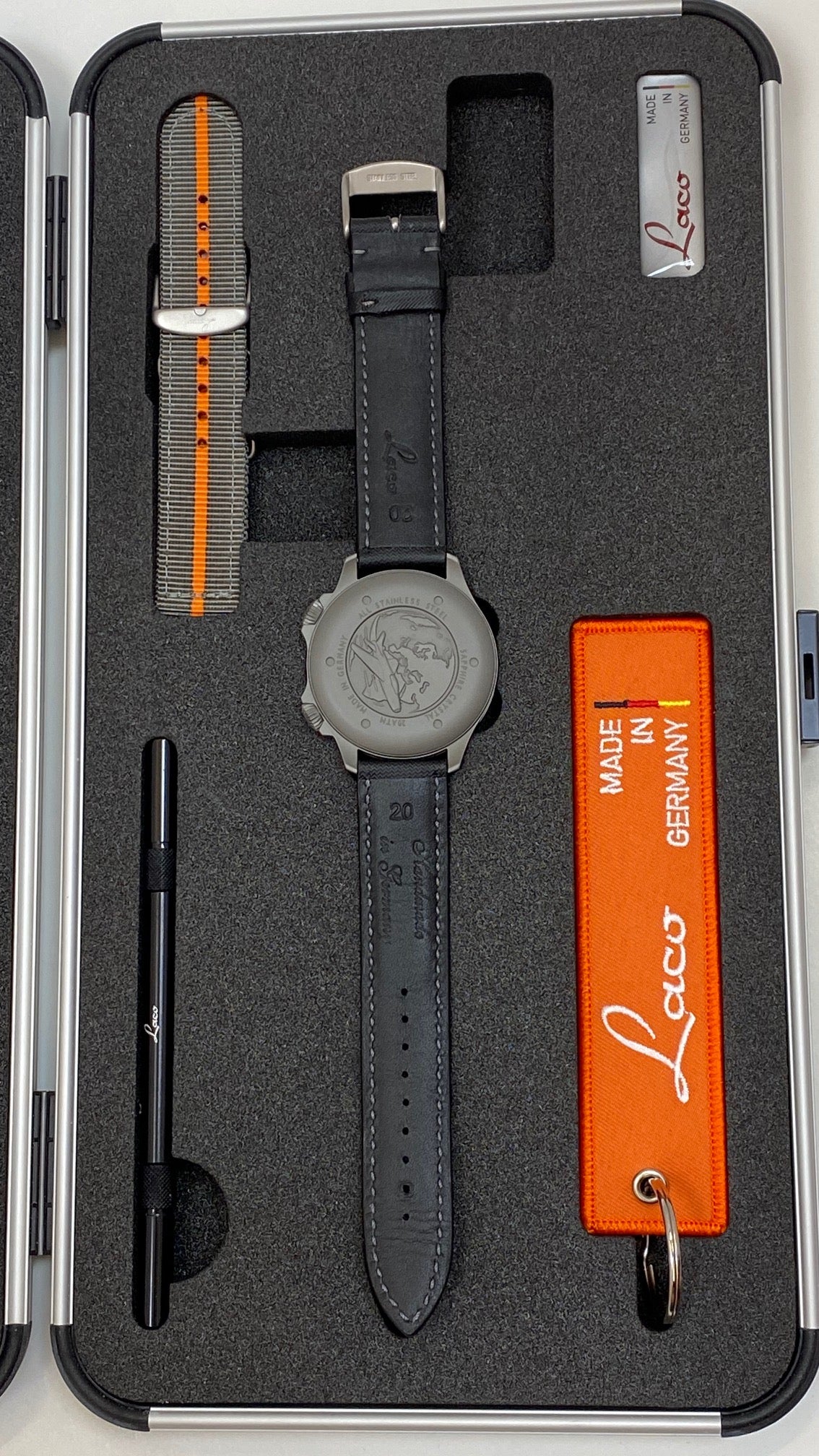 Comes complete with black leather strap, Grey/orange Nylon strap, aluminum box, key chain and strap remover tool