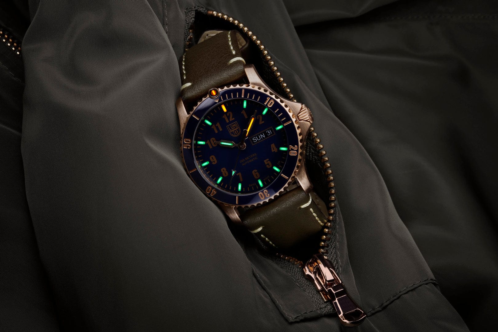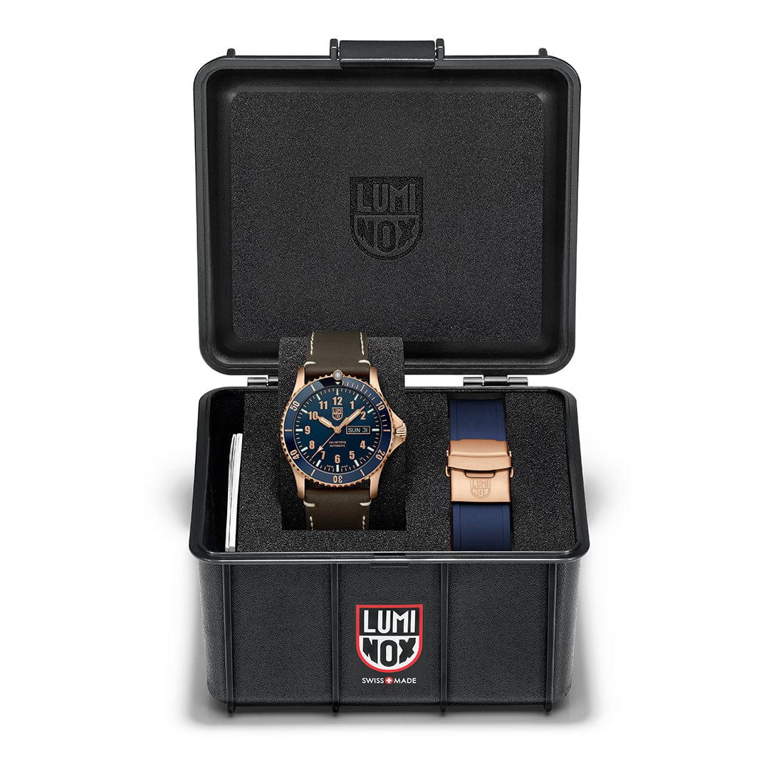 Genuine leather with bronze signature Luminox buckle and a Genuine rubber Navy Blue cut-to-fit strap with bronze singnature Luminox buckle. Additional, the Bronze Automatic Sport Timer comes with its very own WOLF Watch Cub winder in matching Navy Blue and Bronze tones.