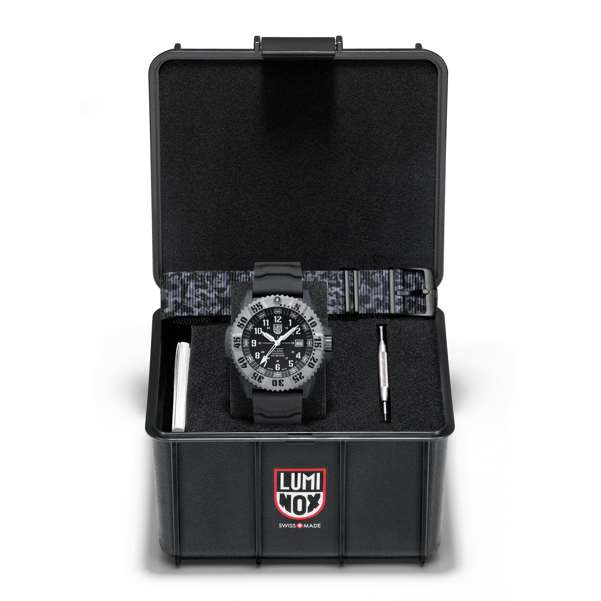 The MIL-SPEC (short for Military Specification) is a must-have watch for military, first responders, the rugged outdoors, as well as true sports lovers who want a unique watch that they can rely on, whether on land, sea or in the air. The Luminox 3350 series is developed and built in compliance with the technical requirements for military standard set by the U.S. Department of Defense. The movement with HeavyDrive produces a counter-impulse when subjected to shock to prevent the hands from skipping, making it more tolerant to imbalances. The movement with PreciDrive, using a thermocompesation unit, the motor pulses according to changes in the ambient and water temperature. This watch Packaged as a set, the MIL-SPEC comes on a black rubber strap with CARBONOX™ signature buckle with an additional camo webbing strap and strap-changing tool.