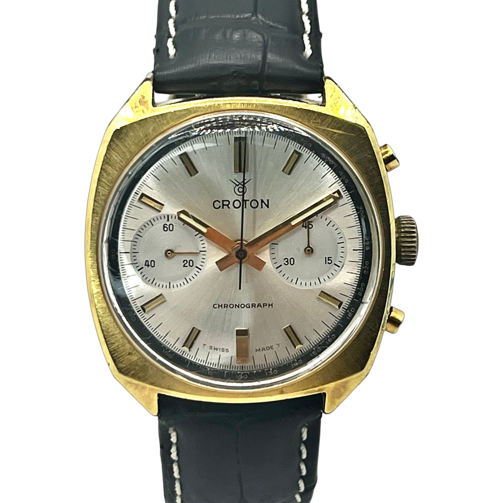 Dial: Silver-toned with chronograph subdials and a telemeter scale around the outer edge. It is signed "Croton" and "Chronograph".