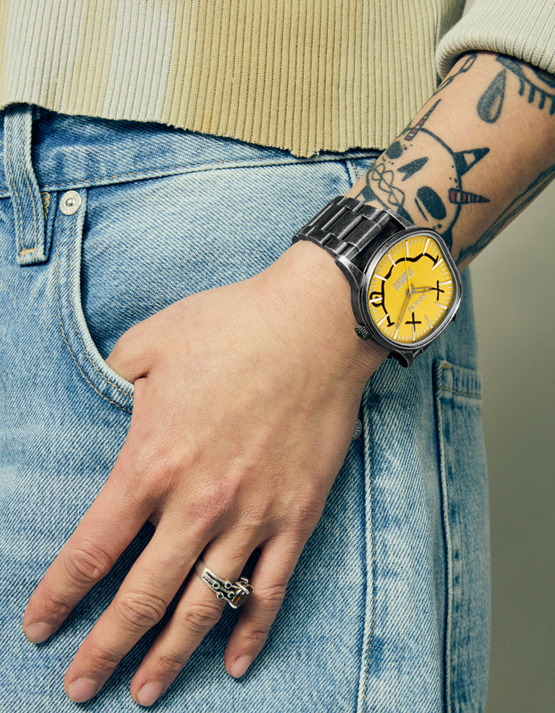 Nixon x Nirvana Wobble Sentry Stainless Steel Watch. Your eyes are not playing tricks on you. Meet the Nirvana Sentry Wobble. Nixon's iconic mid-size analog watch has been bent, molded, and contorted to match Cobain's hand drawn iconic smile graphic found on the dial and crown.
