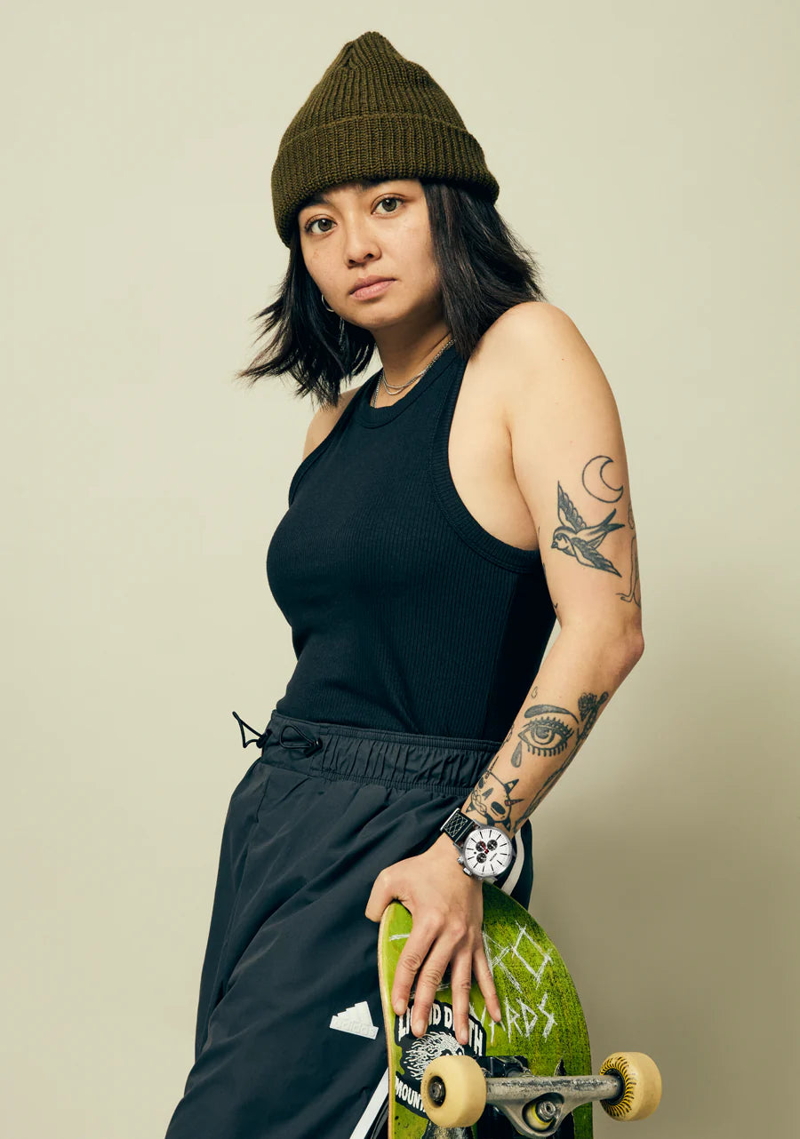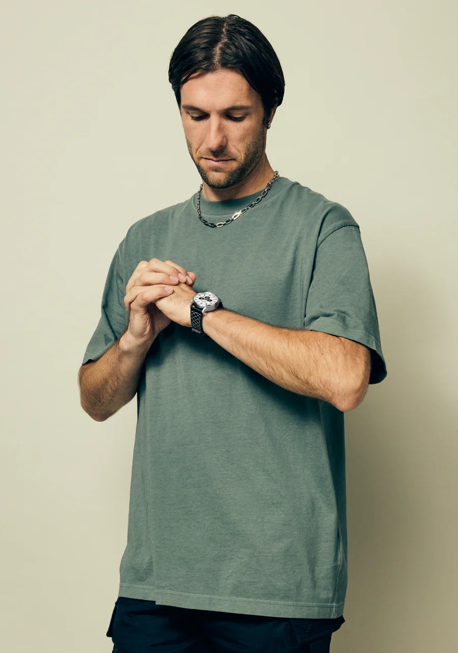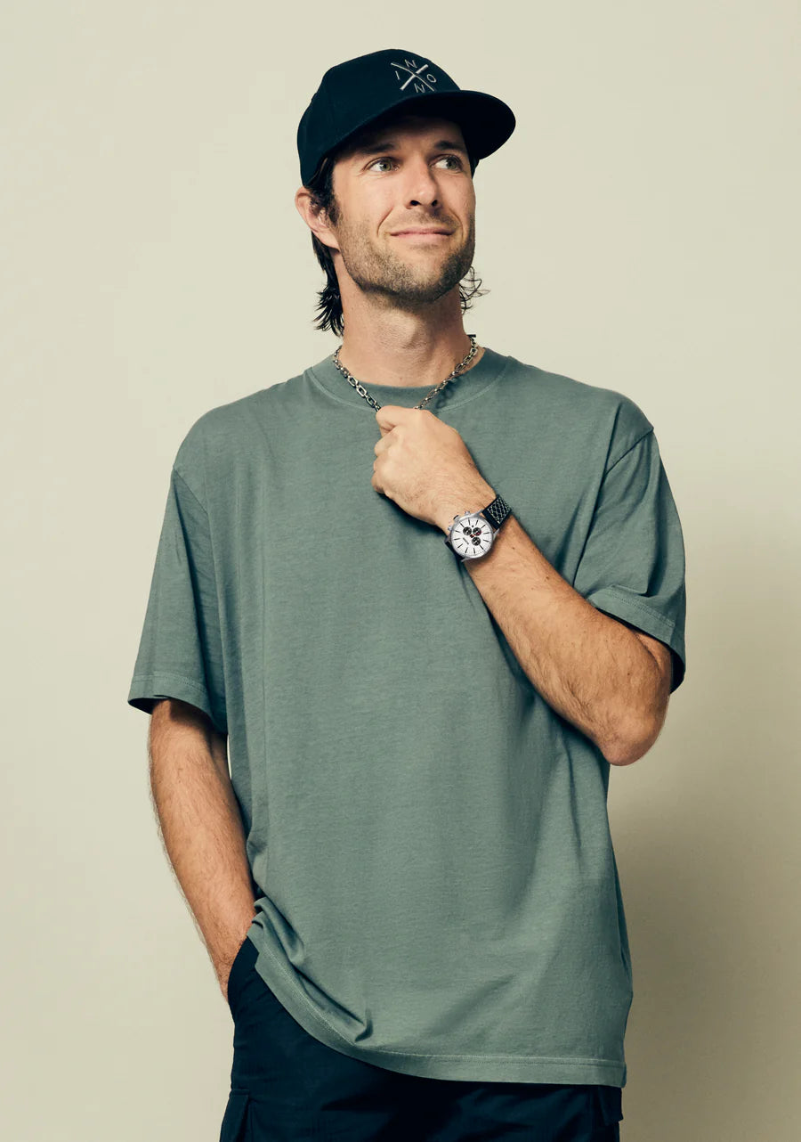 42mm, 100 meter/10 ATM custom solid stainless steel case, fixed stainless steel bezel, hardened mineral crystal, triple gasket stainless steel crown with enamel fill, double gasket stainless steel pushers, stainless steel screw down caseback and spring pin lugs.