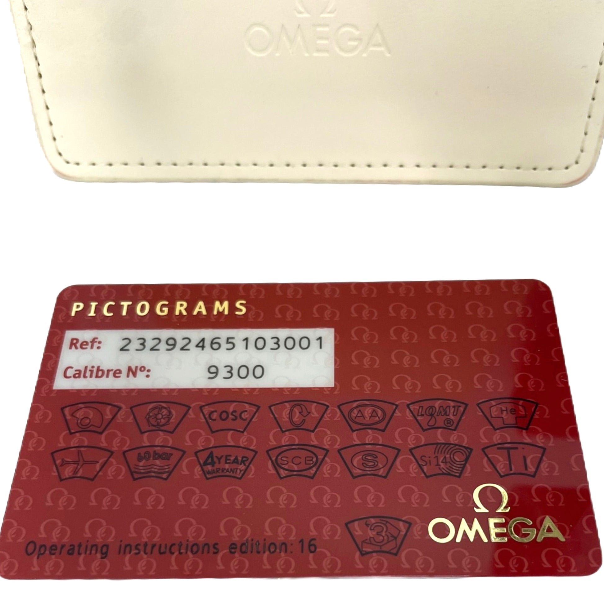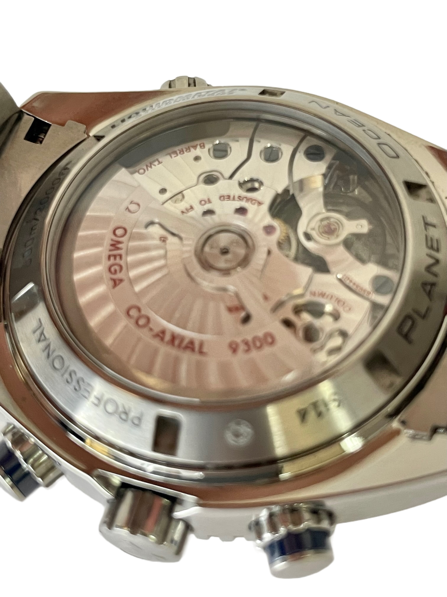 The OMEGA Seamaster Planet Ocean 600M is water resistant to 60 bar (600 metres / 2000 feet), and has a helium-escape valve. The OMEGA Co-Axial calibre 9300 at the heart of this certified chronometer timepiece can be seen through the transparent caseback.