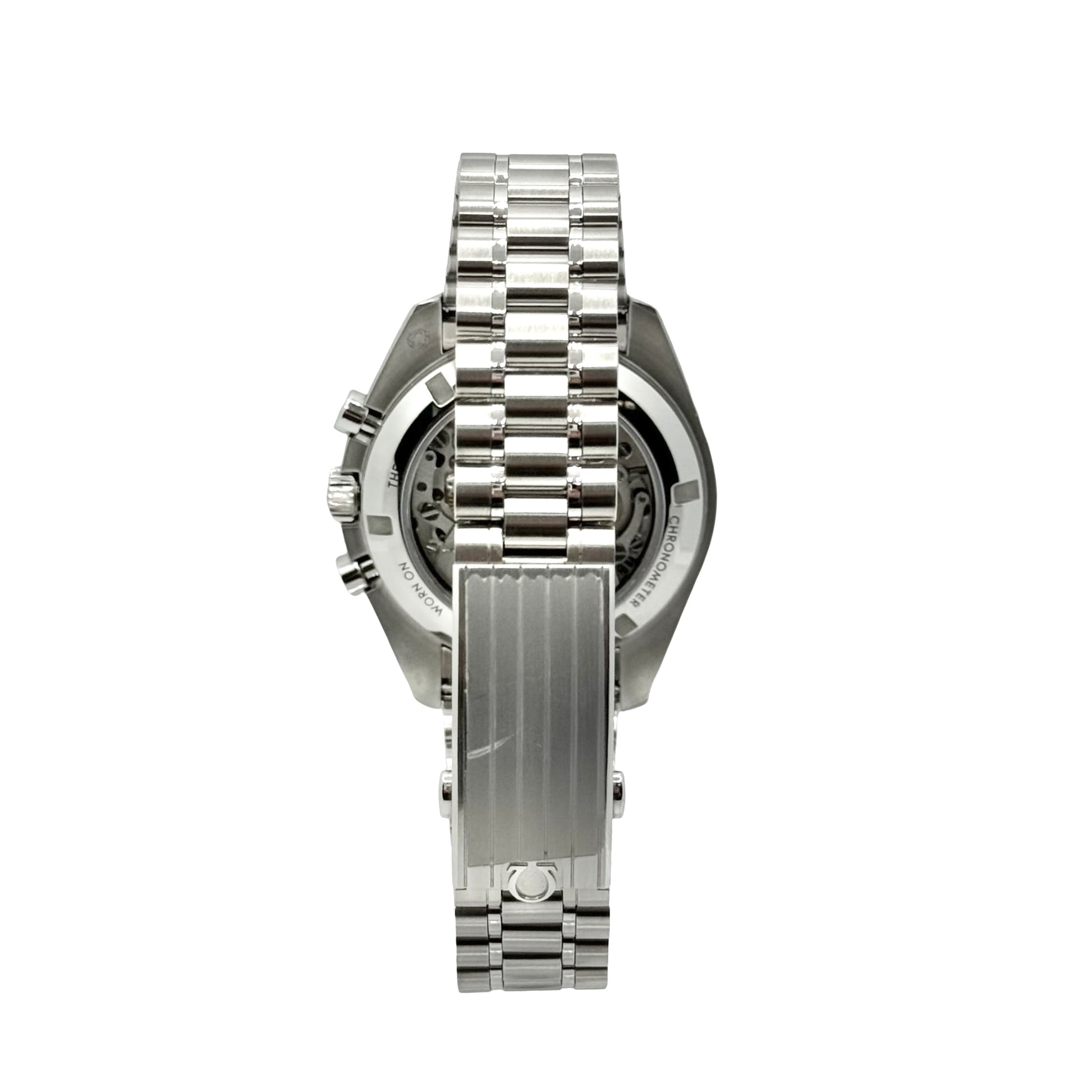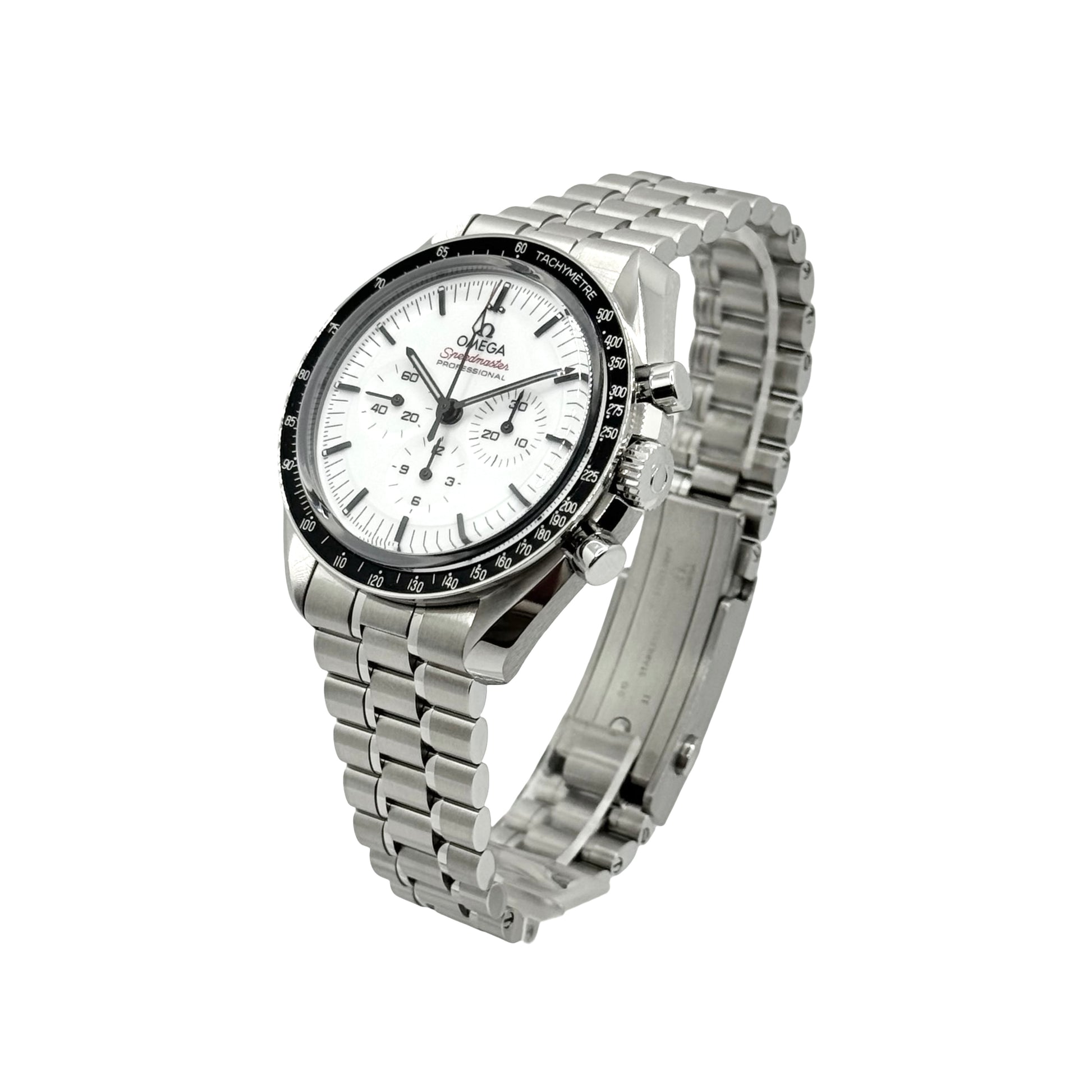 Presented on a polished-brushed bracelet, this 42 mm Moonwatch in stainless steel features sapphire crystal glass on the front as well as on the caseback. Inspired by the 4th generation Speedmaster style worn on the moon, it also includes an asymmetrical case, a white lacquered step dial with applied OMEGA logo and indexes, Moonwatch style hands, and the famous dot over 90 on the black anodised aluminium bezel ring.