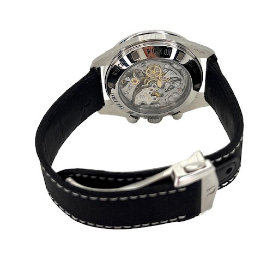 Famous manual-winding chronograph movement. A descendent of the calibre that was worn on the Moon. Rhodium-plated finish.