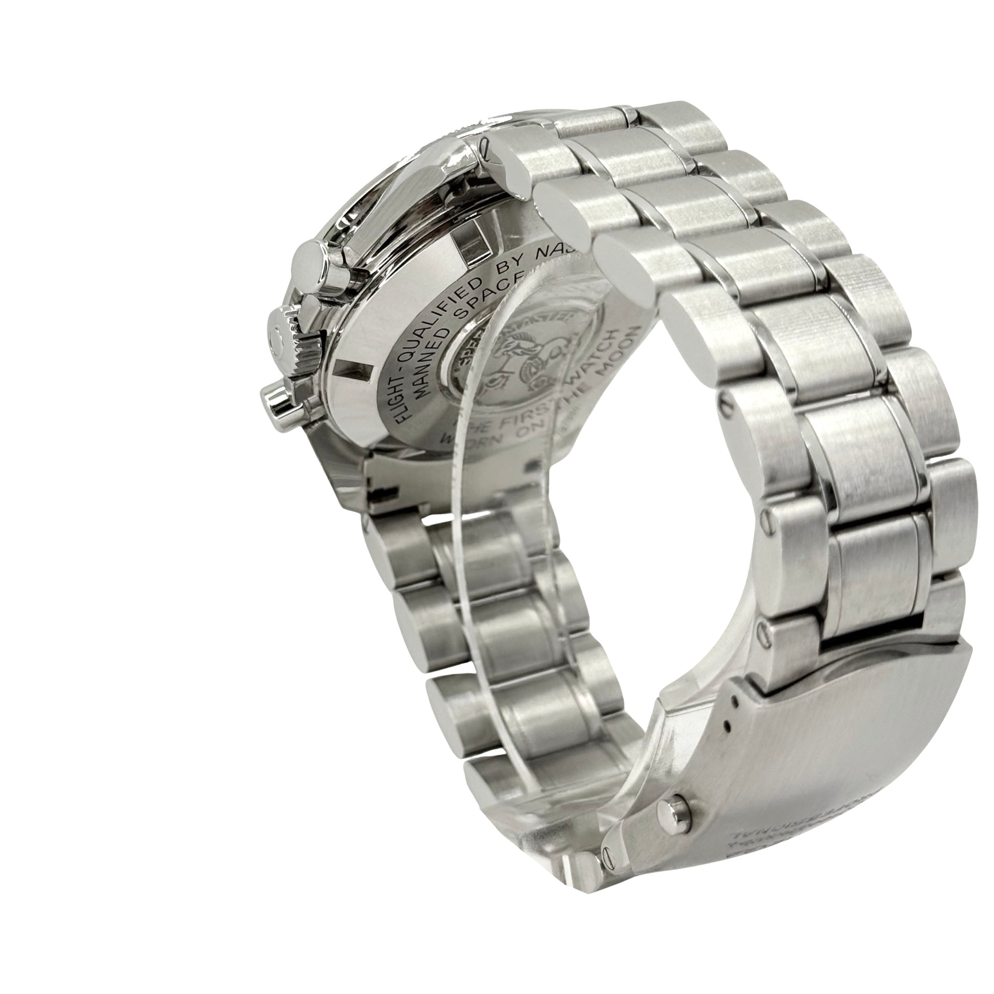 Accessories: Complete Set! Original Omega Box, Pictogram card, International warranty certificate, manual, extra Omega black strap, magnifying loupe, steel Speedmaster emblem