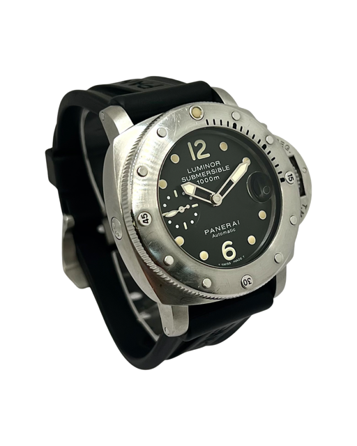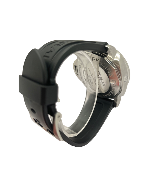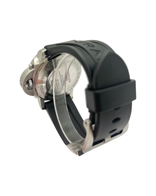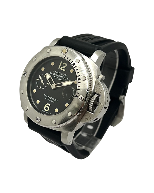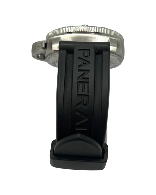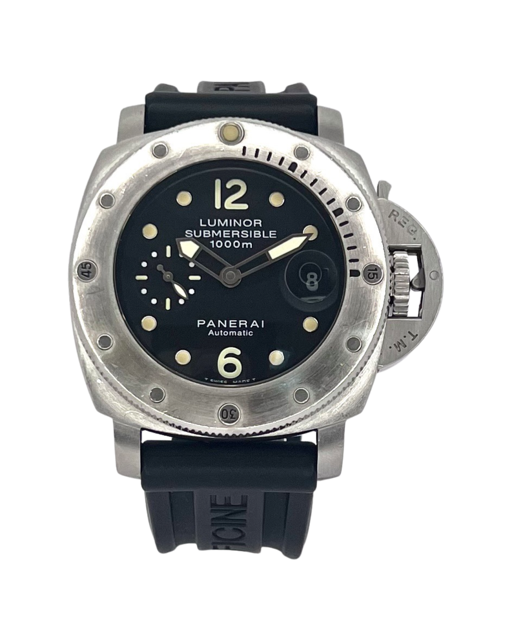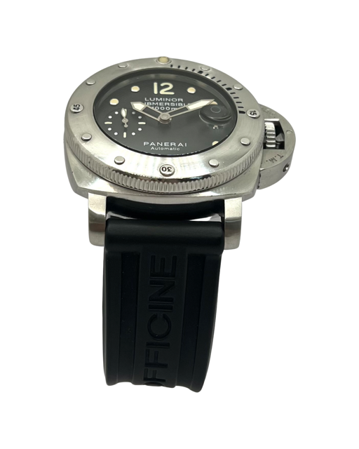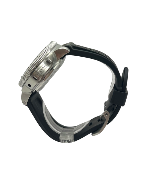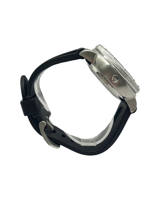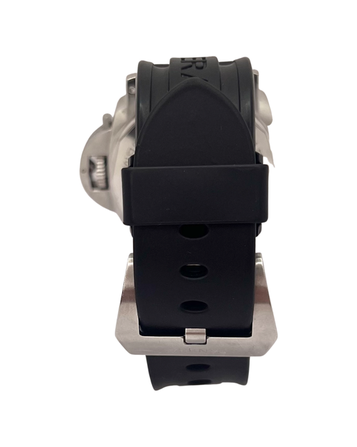 Dial: Matte black, Luminous dot indices, Arabic numerals at 12 and 6 o'clock, small sub seconds hand, Date aperture at 3 o'clock