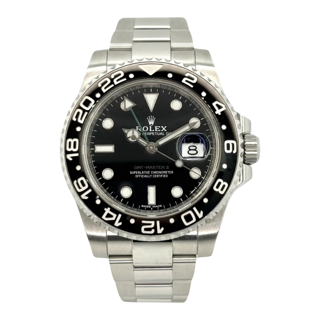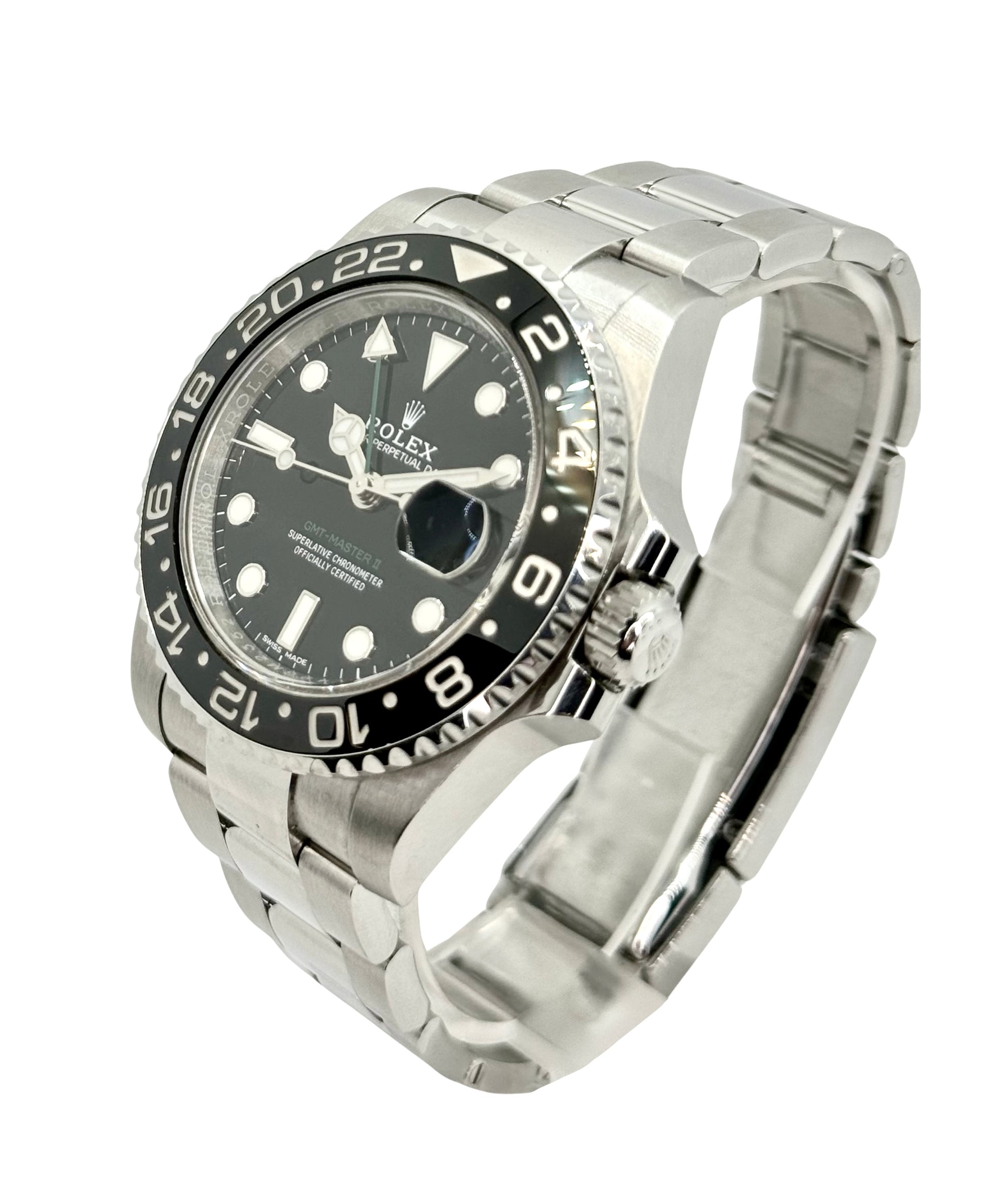 Dial: Black, Date aperture at 3 o'clock, green "GMT-Master II" lettering, Rehaut Engraved Random Serial number and repeated "ROLEX" letters.